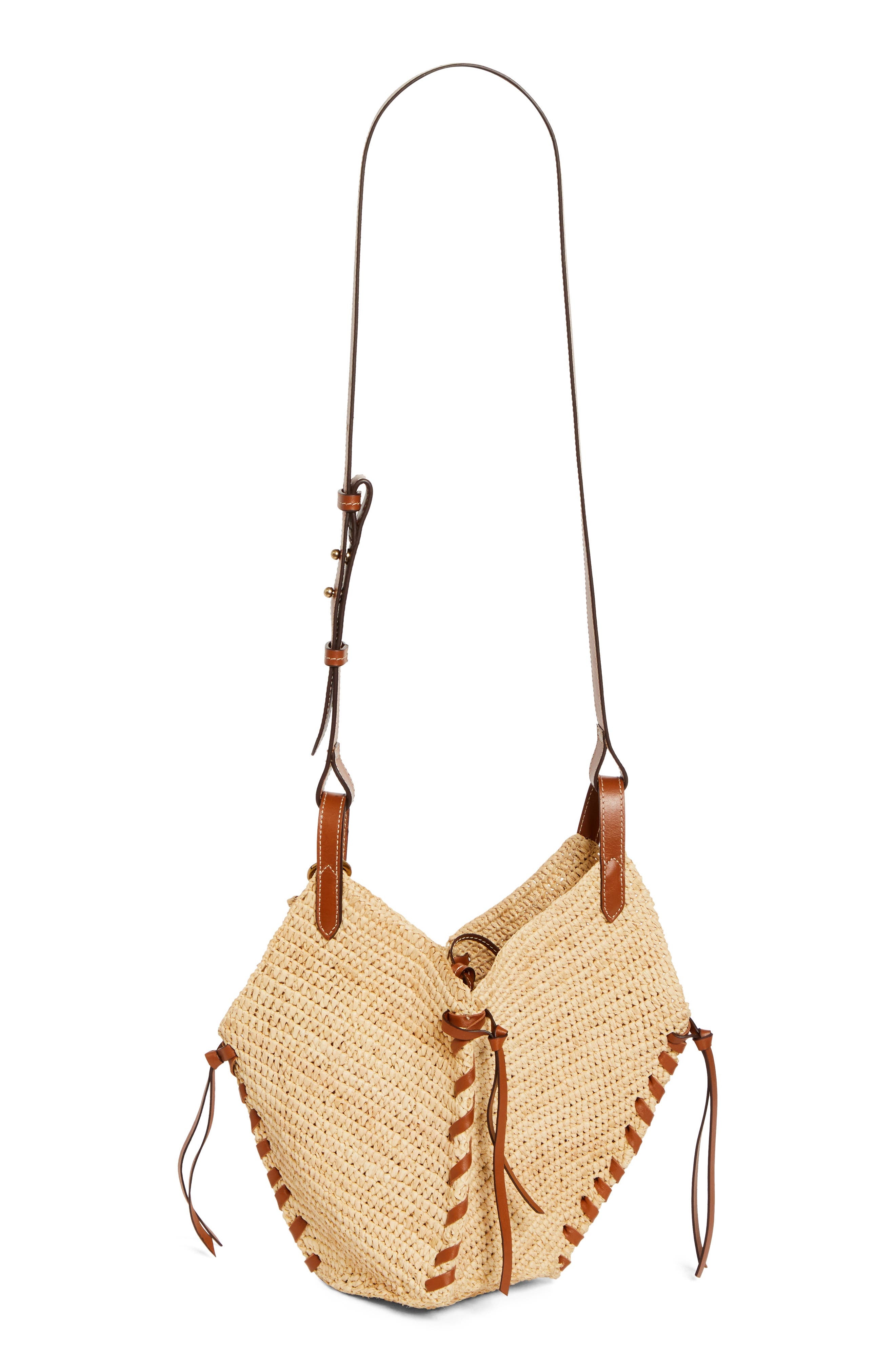 Contrast whipstitching highlights the trapezoidal silhouette of this boho-chic shoulder bag woven from raffia and finished with leather trim. Open top Adjustable shoulder strap Unlined Raffia with leather trim Imported Designer Handbags