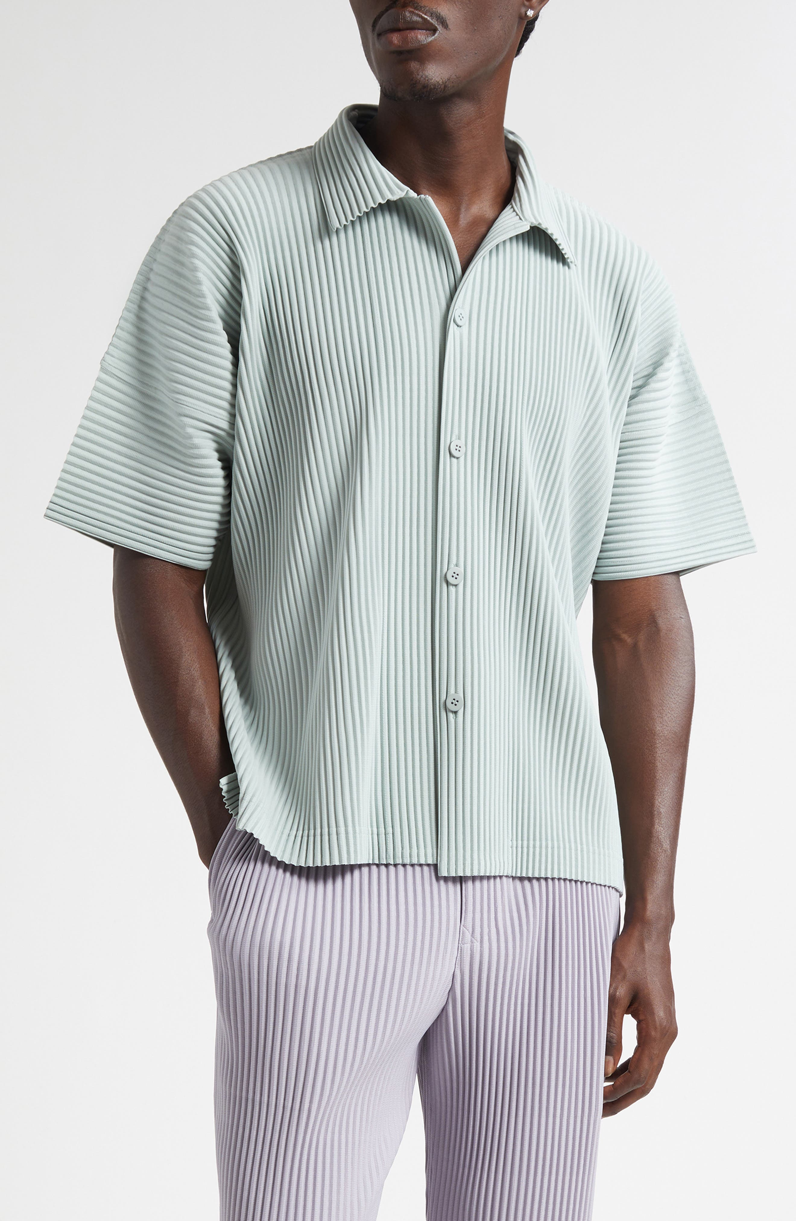 Homme Plissé Issey Miyake Monthly Colors July Pleated Short Sleeve Button-Up Shirt in Sericite Blue
