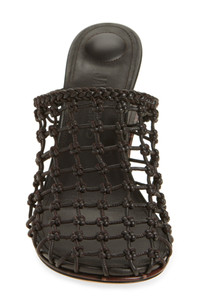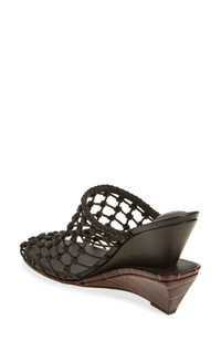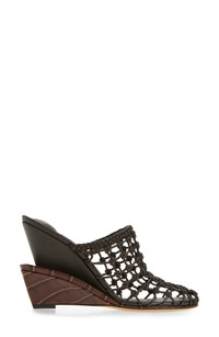 A stacked wedge silhouette lends sculptural impact to a chocolate-colored leather sandal designed with an intricately knotted upper and croc-embossed base. 4" (100mm) heel Leather upper, lining and sole Made in Italy Designer Shoes