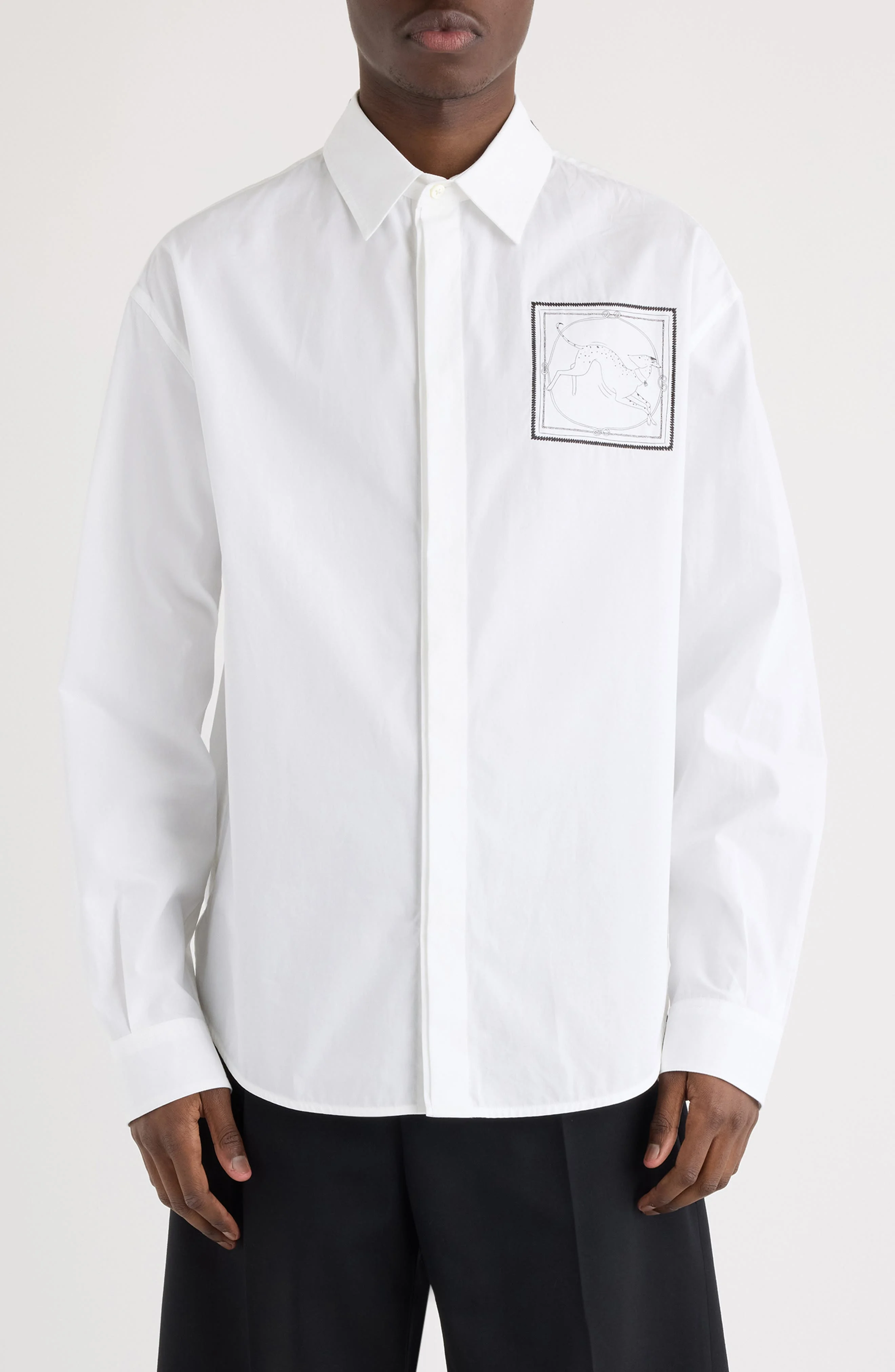 Breathable cotton poplin sets a crisp stage for Simon Porte Jacquemus’s signature wit as an embroidered patch animates the chest of this shirt refined with a clean-lined hidden-button placket and sharp point collar. Front button closure Point collar Long sleeves with button cuffs Curved hem 100% cotton Dry clean Made in Portugal Designer Clothing