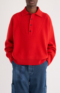 The French label brings understated luxury to your essentials with this relaxed polo-sweater rendered in cashmere-softened merino wool. Button half placket Spread collar Long sleeves Dropped shoulders Ribbed cuffs and hem 90% merino wool, 10% cashmere Dry clean Made in Portugal Designer Clothing