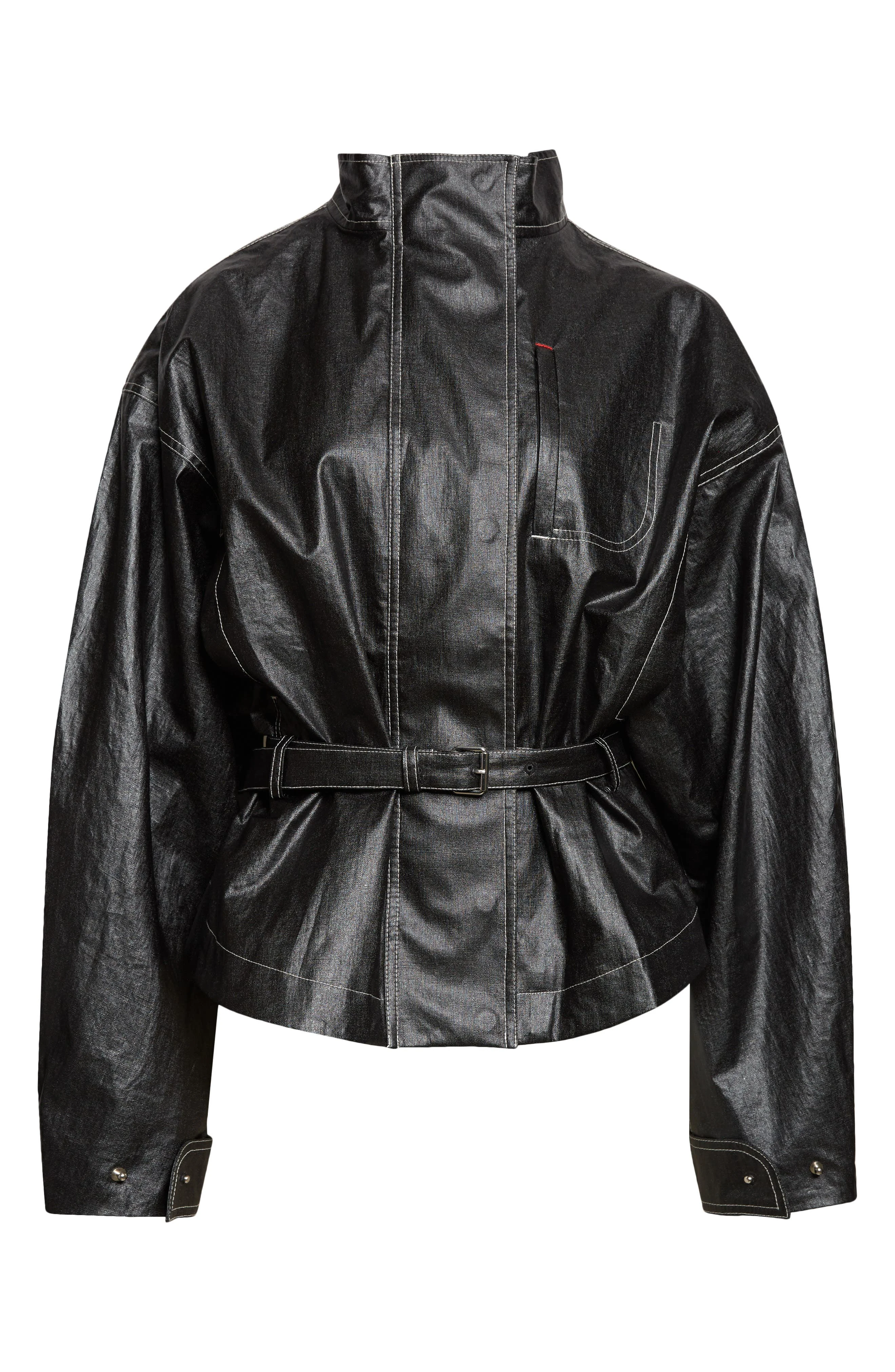 Coated linen gives this jacket a dark, polished gleam, then bold topstitching drags across it like hand-drawn contour lines on a map. The posh stand collar holds the frame with quiet authority, while roomy dropped shoulders relax the structure into a modern proportion. Belt it to carve out a clean hourglass or leave it loose and let the volume flare and move. Branding stays out of the spotlight, with only a subtle signature 'J' loop at the nape for those who notice details. Front zip closure with snap storm placket Stand collar Adjustable cuffs Chest welt pocket; front welt pockets Dropped shoulders Removable belt Lined 100% linen Dry clean Imported Designer Clothing