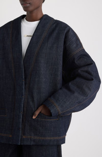 Cut from rigid denim with real presence, this cardigan stands with quiet architecture. Roomy dropped shoulders and a straight hem sketch a kimono-inspired frame that skims the body, while subtle monogram embroidery offers a quiet signature. Hidden-snap placket Deep V-neck Long sleeves Front welt pockets Lined 100% cotton Dry clean Made in France Designer Clothing