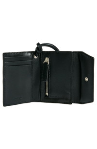 Slim and smart, this compact leather wallet keeps credit, currency and other small essentials at hand with a knotted strap that wears like a lanyard. Magnetic-snap flap closure Removable lanyard Interior zip and slip pockets; three card slots Cotton lining Leather Made in Spain