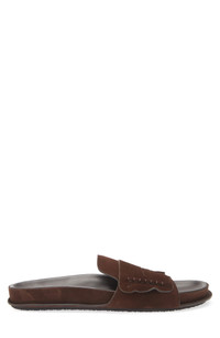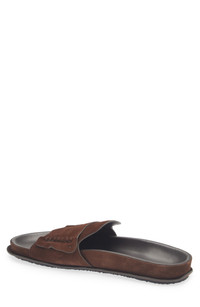 Loafer-inspired detailing elevates a relaxed slide sandal crafted in Portugal from chestnut-colored suede. Leather upper and lining/rubber sole Made in Portugal Designer Shoes