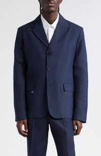Structured shoulders further the polished look of a straight-fit blazer embellished with a D-ring detail at the front flap pocket for utilitarian allure. Three-button closure Notched lapels Four-button cuffs Front flap pockets Lined 100% viscose Dry clean Imported Designer Clothing