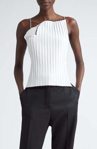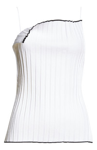 Contrast trim traces the hem and the winking asymmetric neckline on this pleated knit camisole topped with spaghetti straps and detailed with a D-ring at back. 20" length (size 42 FR) Asymmetric neck Spaghetti straps 73% viscose, 19% polyamide, 5% polyester, 3% elastane Dry clean Made in Portugal Designer Clothing