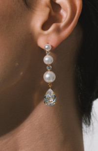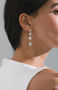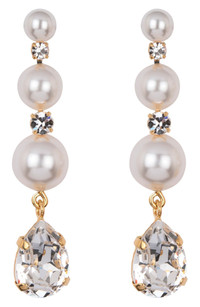 Creamy glass pearls and Austrian crystals alternate luster and sparkle as they cascade these glamorous drop earrings handcrafted in New York. 2" drop; 7mm width Surgical steel post back Glass faux pearl/glass/18k-gold plate Made in the USA