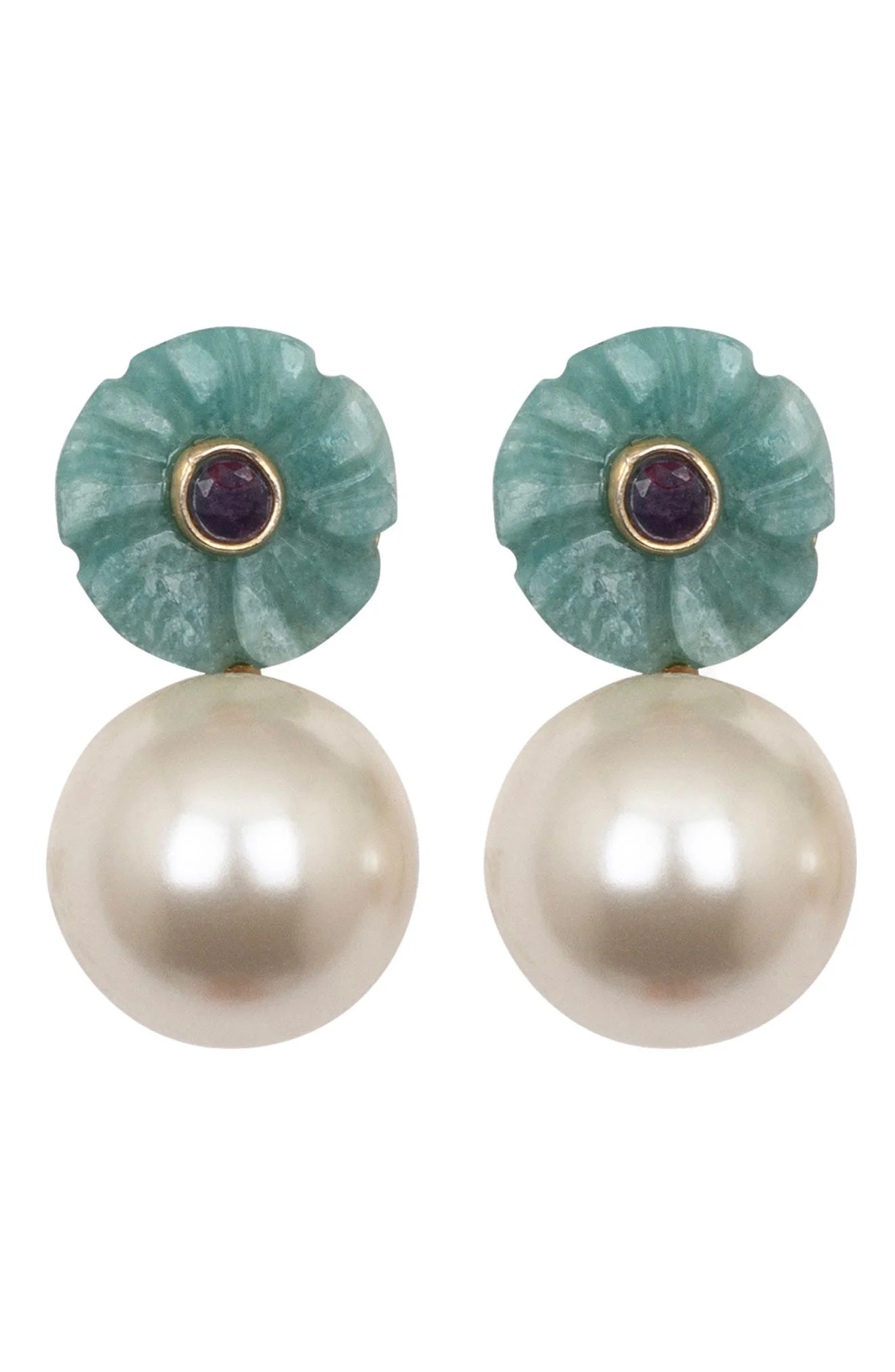 Carved amazonite flowers with contrast crystal centers bring rich color to these handcrafted earrings finished with Austrian crystal pearl drops. 1" drop Post back 18k-gold plate/amazonite/glass/glass faux pearl Made in the USA