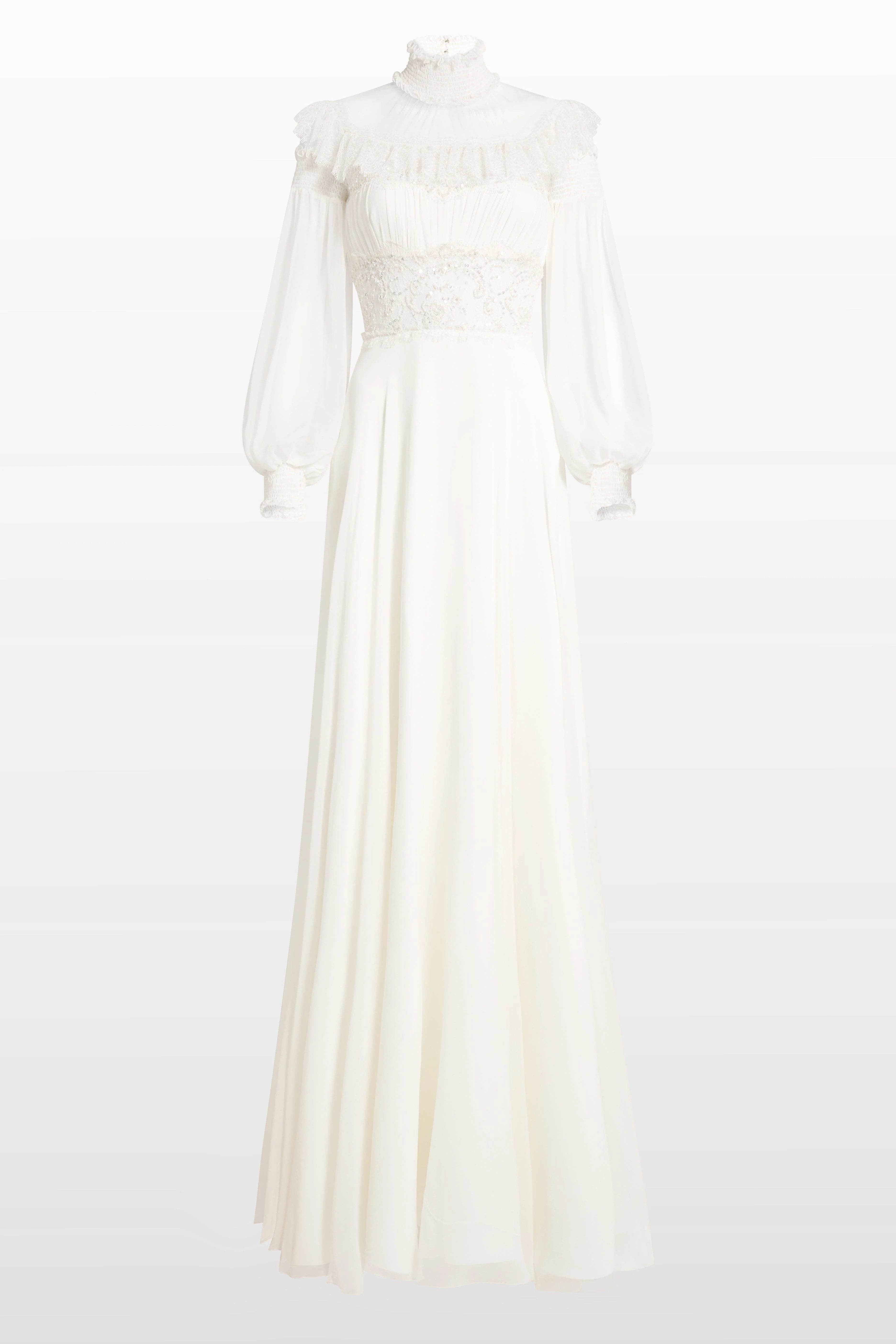 This luxury bridal gown evokes vintage-inspired romance through its high neckline, sheer lace detailing, and billowing chiffon sleeves. The fitted waistline and softly flowing skirt create an effortlessly graceful silhouette. Textured lace panels add depth and structure, balancing delicacy with refinement. A designer wedding dress that captures timeless femininity with poetic, ethereal charm. Lace detailing Ruffled trims High neck Long sleeves Embellished waistband