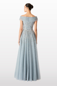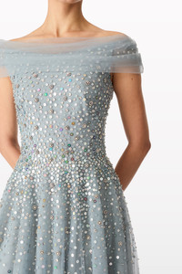 Elegant yet effortless, this off-shoulder gown is crafted for modern romance with a clean, sculpted neckline and a full, airy skirt that moves with subtle drama. The bodice is densely hand-embellished with reflective crystals that gradually disperse into soft layers of tulle, creating a light-catching gradient that feels both polished and poetic. Designed to flatter from every angle, this piece brings a sense of ease to high-glamour dressing ideal for moments that call for quiet impact. Concealed rear zip fastening Crystal embellishment Bead embellishment Draped detailing