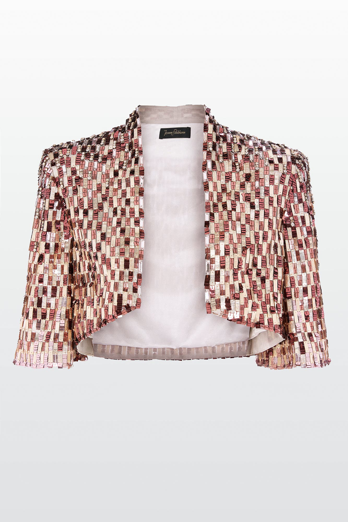 This jacket showcases intricate sequin detailing with a sophisticated and textured design. Structured shoulders and an open front lend a contemporary touch, while the cropped length enhances its modern elegance. It's ideal for making a statement at upscale events or special occasions. Highlights Open front Half-length sleeves Collarless Sequin embellishment