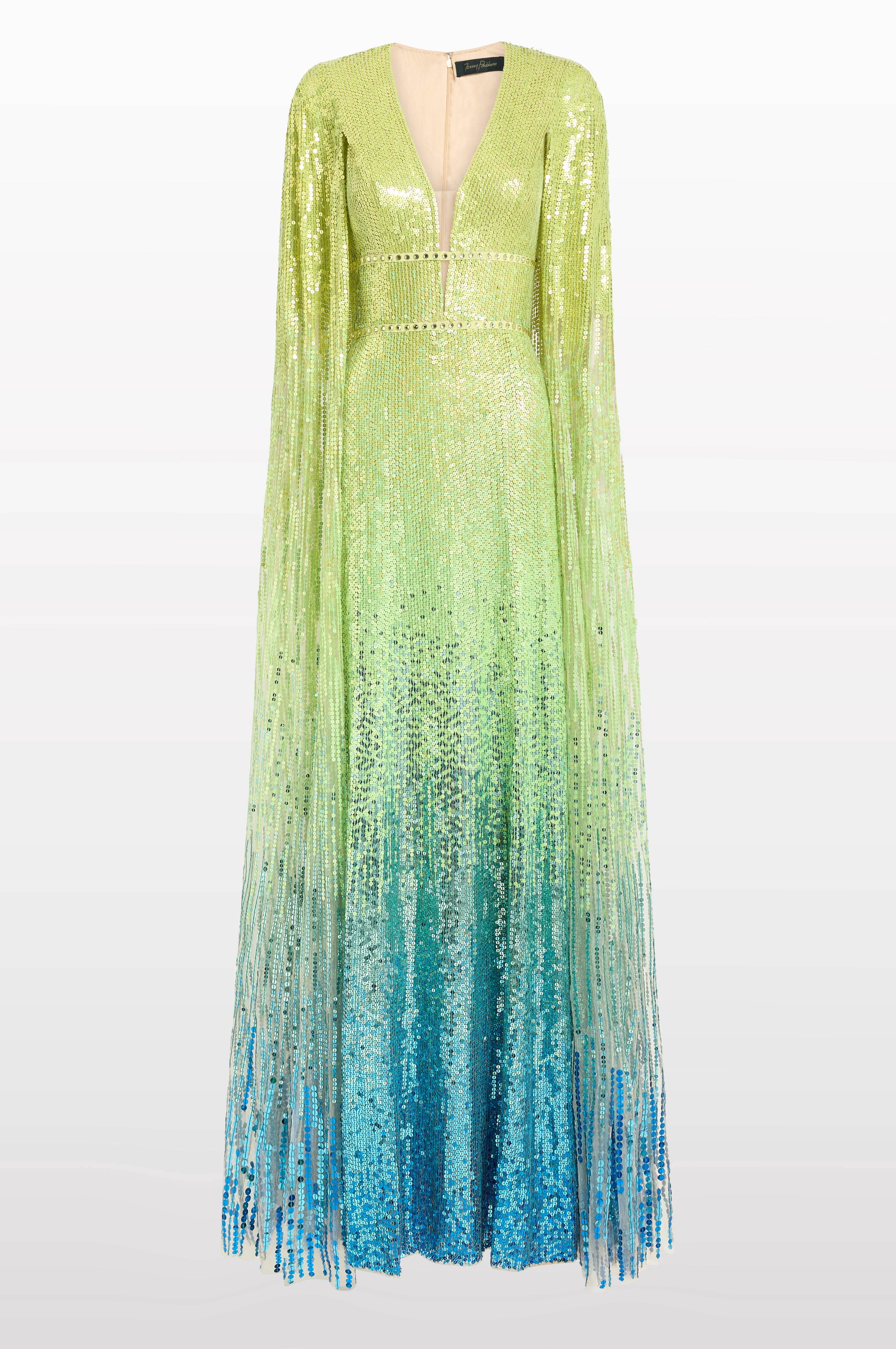 This gown exudes modern drama with its sculpted silhouette, plunging neckline, and floor-length cape sleeves. The ombr sequin finish adds depth and movement, creating a shimmering, fluid effect. A statement piece designed to captivate, blending elegance with high-impact glamour. Sequin embellishment V-neck Cape sleeves Ombre effect Zip fastening