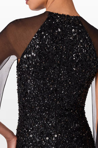 An exquisite evening dress that exudes celestial-inspired glamour, this piece is adorned with intricate embellishments that sparkle across its flowing silhouette. The detailed beadwork and subtle shimmer evoke a sense of sophistication, while the graceful drape ensures effortless movement. Perfect for high-profile events, it embodies timeless elegance with a contemporary allure. Highlights Concealed rear hook and zip fastening Long draped sleeves Bead embellishment Sequin design