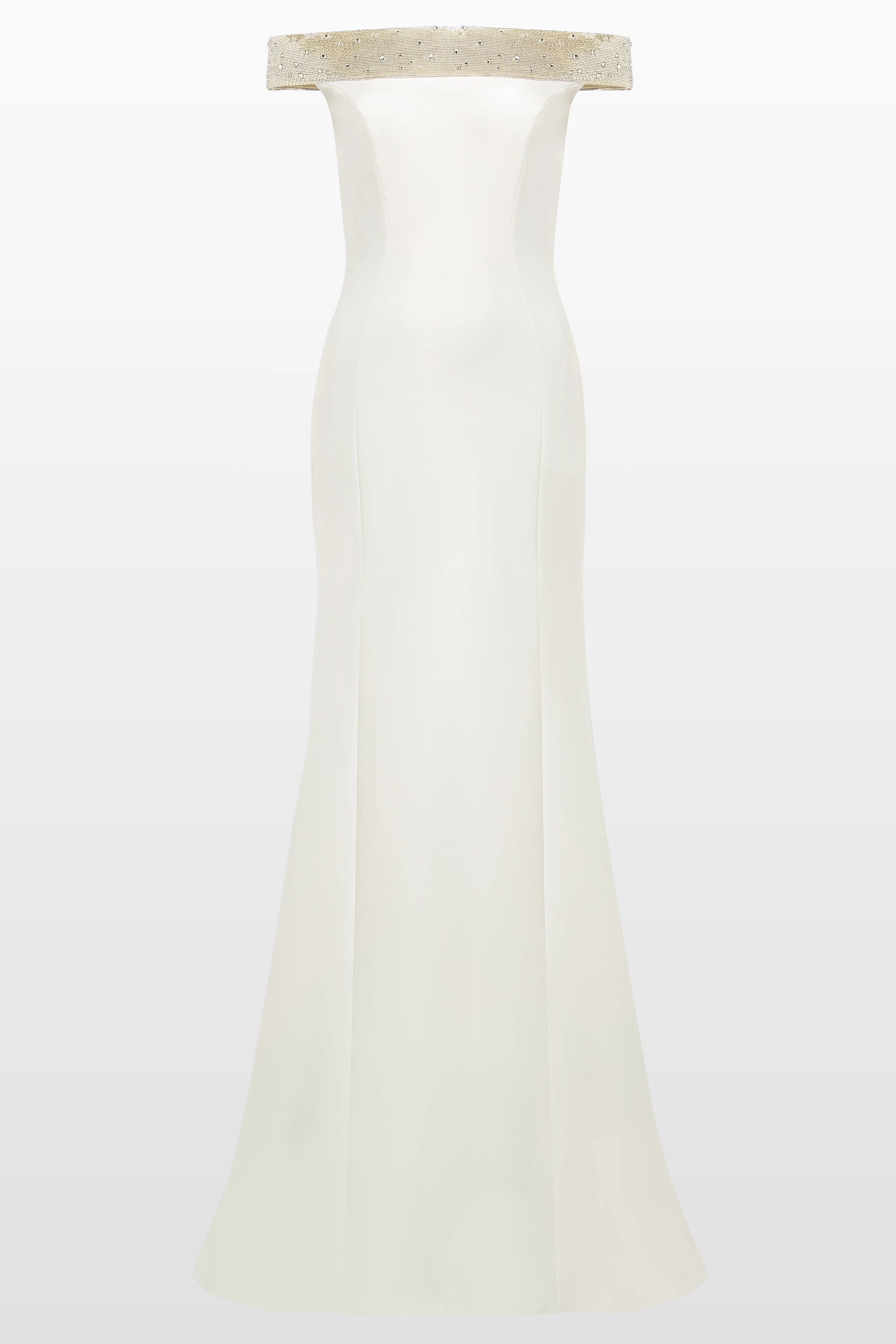 This enchanting gown gown exudes timeless sophistication with a clean, modern silhouette. The off-the-shoulder neckline is framed by a shimmering band of beading, adding subtle sparkle to the minimalist design. The fitted bodice flows into a gently flared skirt, creating an elegant, elongated shape. A refined choice for occasions that call for effortless grace and understated glamour. Off-shoulder Bead embellishment Concealed zip fastening Floor-length Straight hem