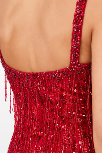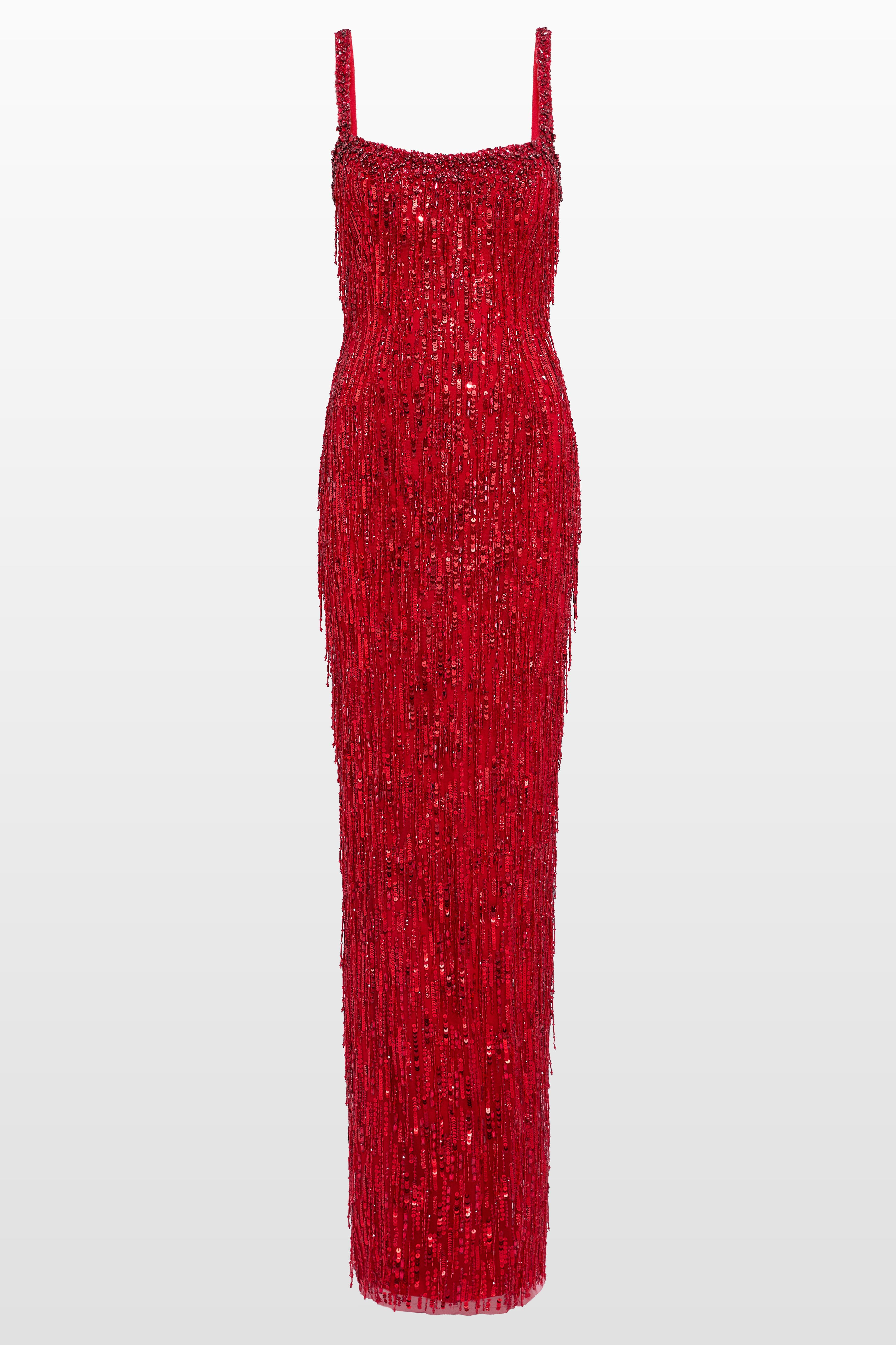 Designed to captivate, this gown sculpts the silhouette with precision and shimmer. Covered in glistening embellishment and delicate fringe, it catches the light with every step, creating fluid, high-impact movement. The square neckline and sleek straps frame the dcolletage, lending a modern edge to its timeless shape. Perfect for black-tie events, gala evenings, or red-carpet occasions where standout glamour is a must. Sequin embellishment Fringe detail Spaghetti straps Square neckline