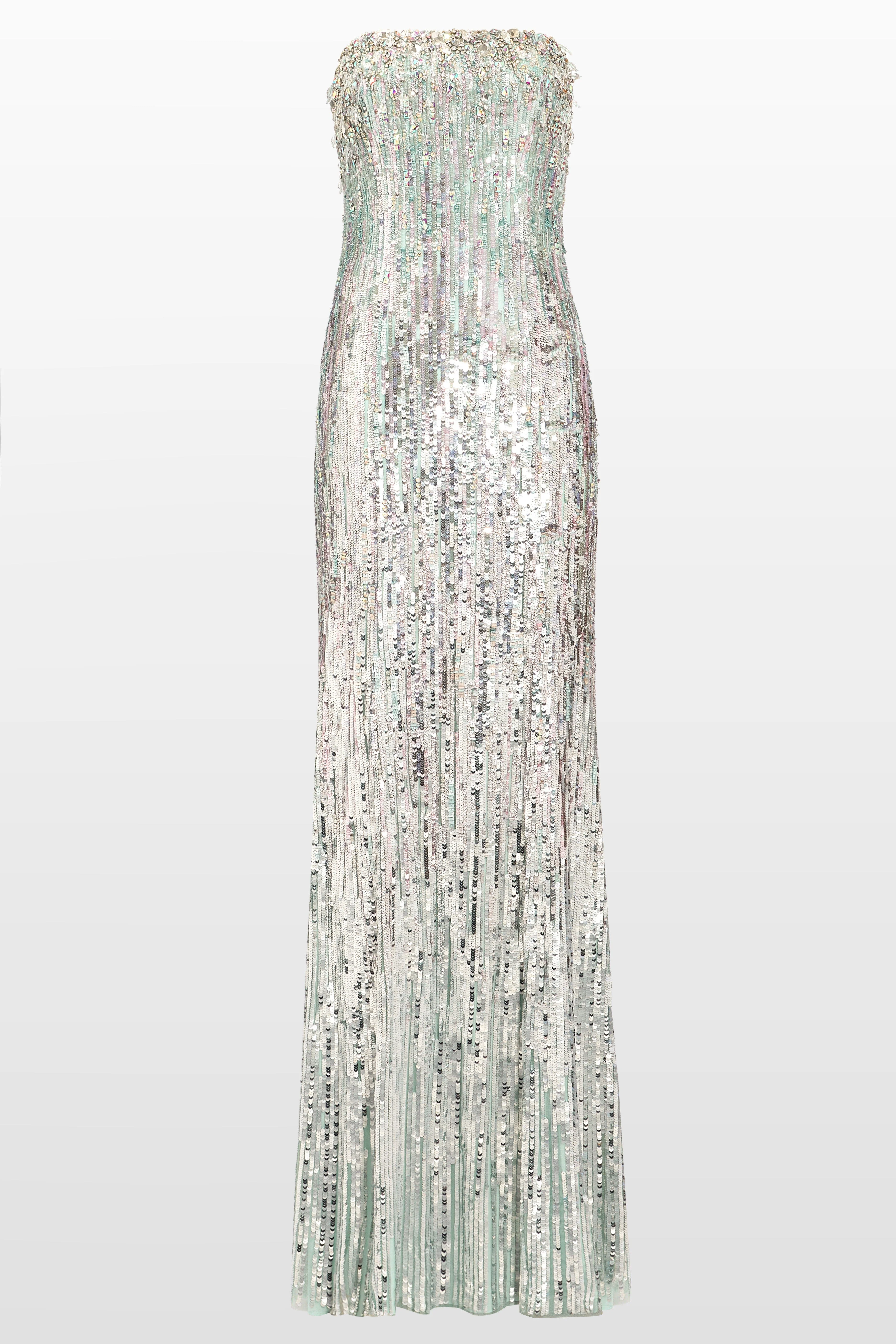 Designed to sculpt and shine, this gown embodies modern glamour with timeless appeal. The strapless silhouette is cut to contour the figure while hand-applied sequins and beads cascade in vertical lines, creating a shimmering, light-catching effect with every movement. A softly structured bodice enhances the feminine shape, while the overall look is designed to dazzle, perfect for evenings that call for effortless sophistication and high-impact allure. Sequin embellishment Sleeveless Rear zip fastening Maxi length