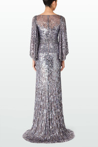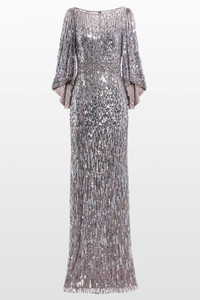 Fully adorned with shimmering sequins, this dress is designed to make a statement. The relaxed sleeves and softly cinched waist offer balance to the all-over embellishment, creating a flattering and comfortable fit. Its floor-length silhouette brings a sense of drama and elegance. Ideal for black-tie events, award nights or high-profile celebrations. Highlights Rear zip fastening Sequin embellishment Boat neck Long sleeves
