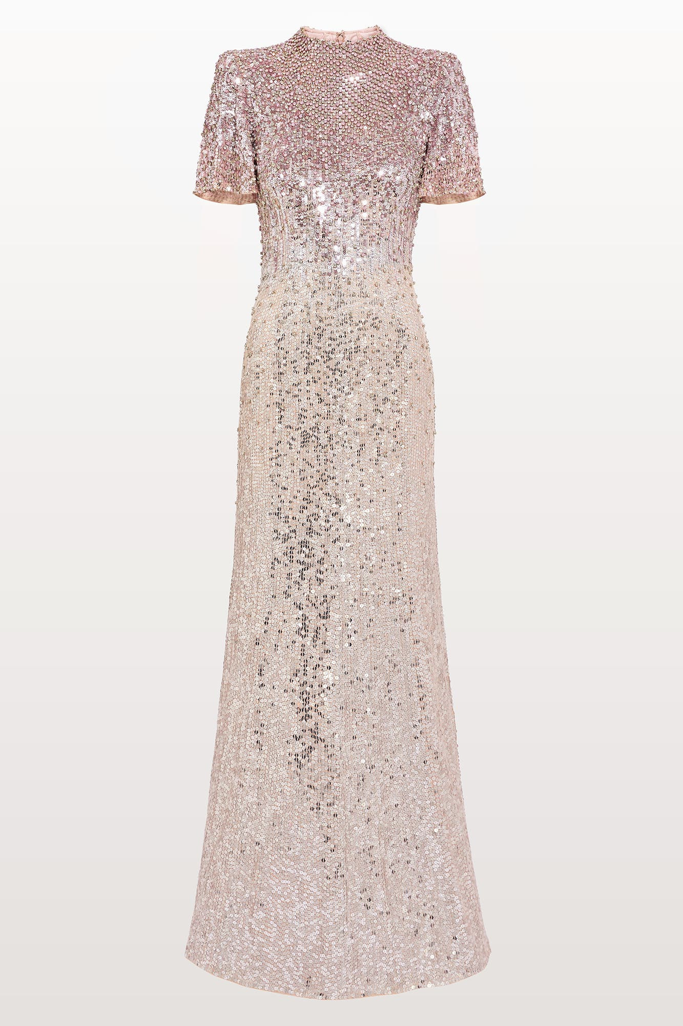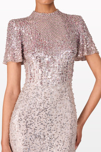 Covered in all-over embellishment, this dress is designed to command attention. The structured shoulders and High Neckline create a strong, sculptural shape, while the floor-length skirt adds fluidity. Short sleeves offer coverage without compromising the modern silhouette. A standout option for awards ceremonies, formal receptions or evening galas. Highlights Fully sequinned Short sleeves Crew neckline