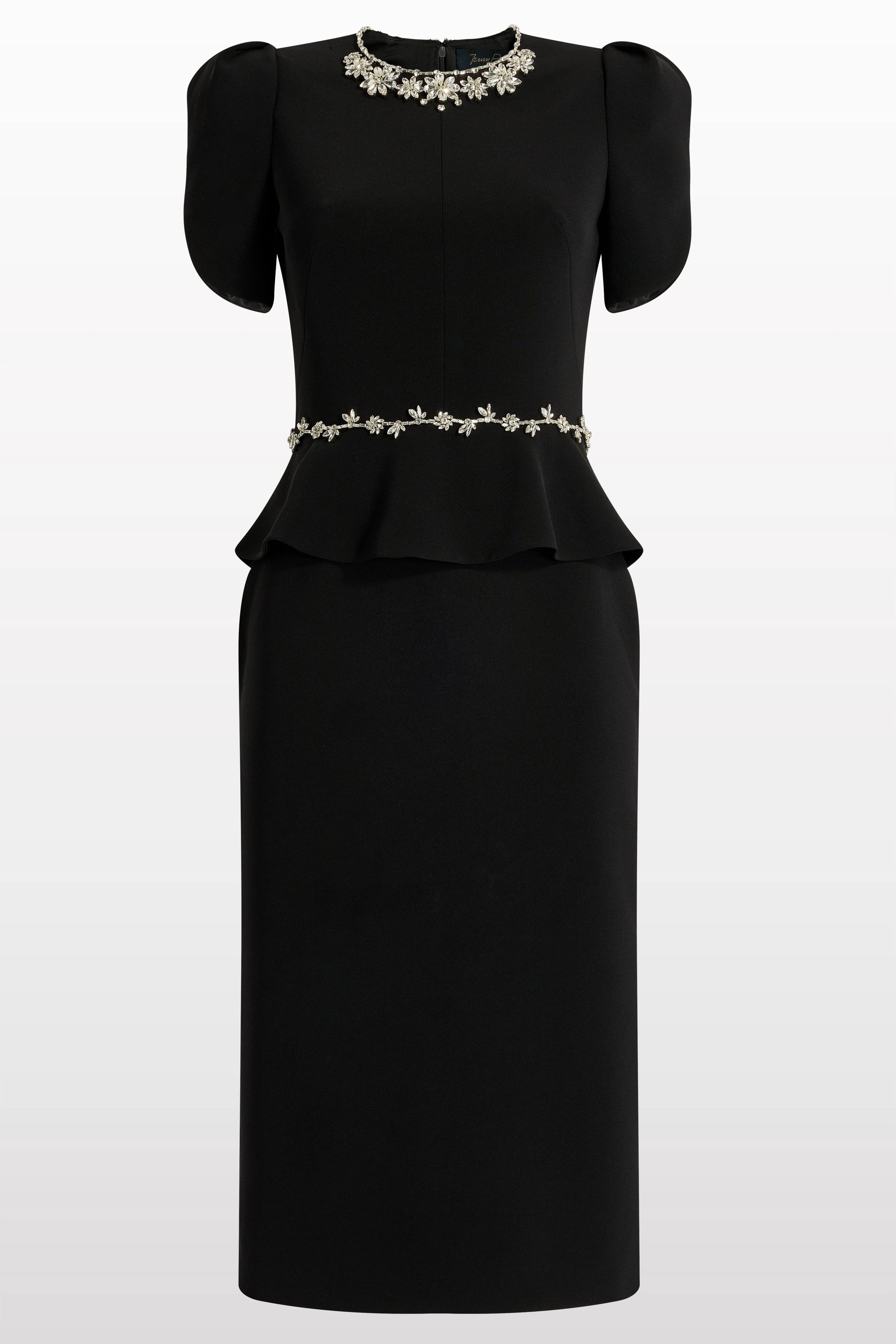 This refined cocktail dress features softly structured sleeves, a defined waist, and a flattering peplum detail. The neckline and waist are adorned with floral embellishments, bringing a touch of radiance to the sleek silhouette. Elegant and timeless, its suited to evening occasions, receptions, and formal gatherings. Embellished neckline and belt Floral embellishment Round neck Puff sleeves Peplum hem Rear zip fastening
