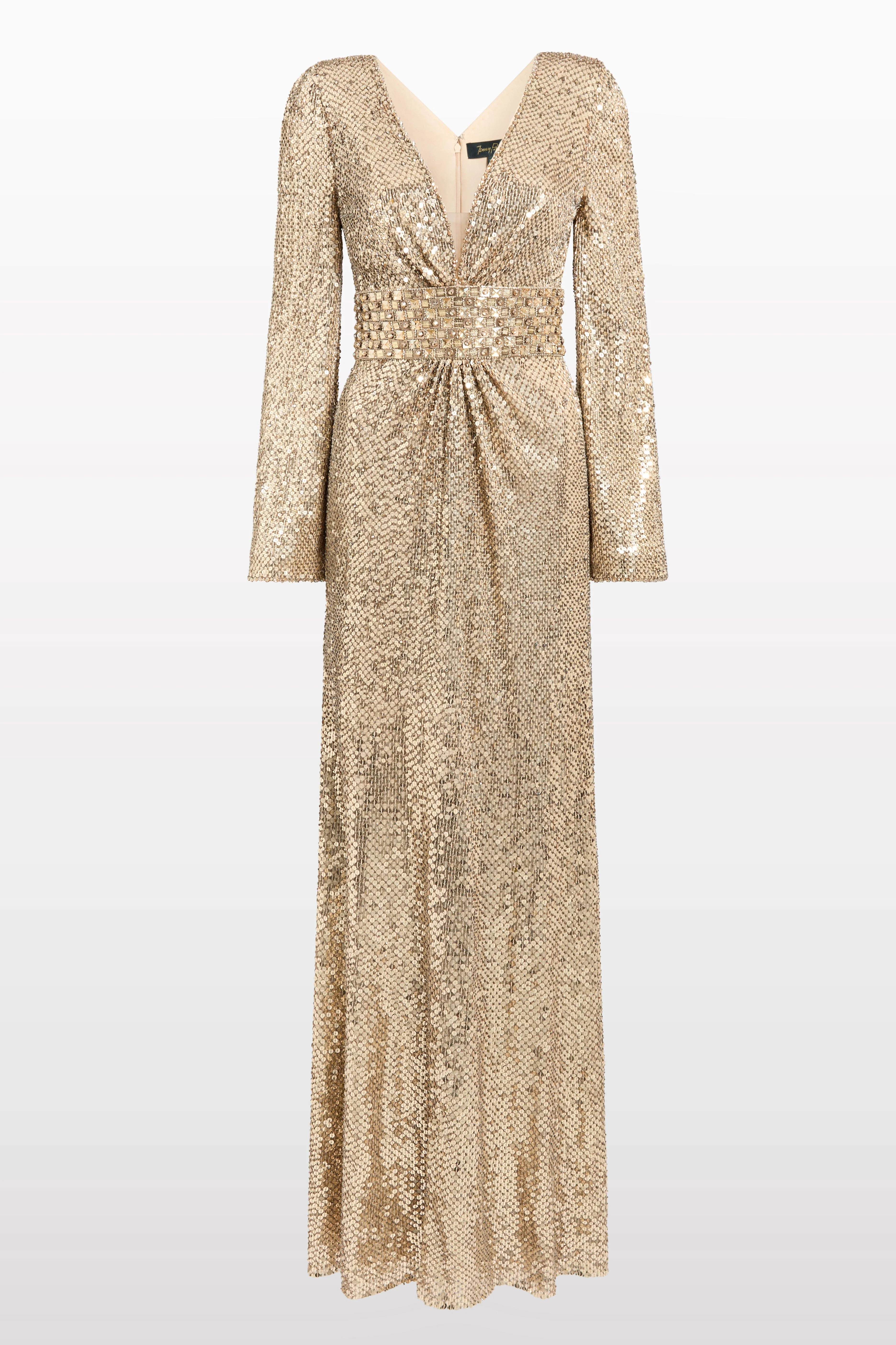 This evening gown is a refined expression of glamour, featuring a plunging V-neckline and long fitted sleeves that create a sleek, elongated silhouette. The cinched waistline is accentuated with intricate embellishment, adding structure and subtle drama to the design. Fully adorned in sequins, it catches the light with every movement for an effortlessly radiant finish. Perfect for black-tie events, gala dinners, or red carpet occasions, this gown ensures timeless elegance with a modern edge. Sequin embellishment V-neck Long sleeves Floor-length