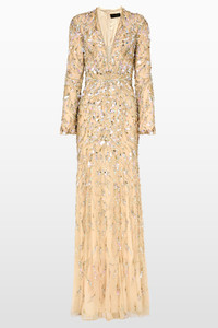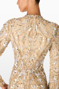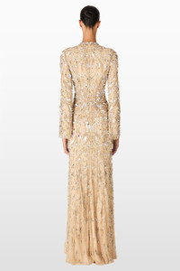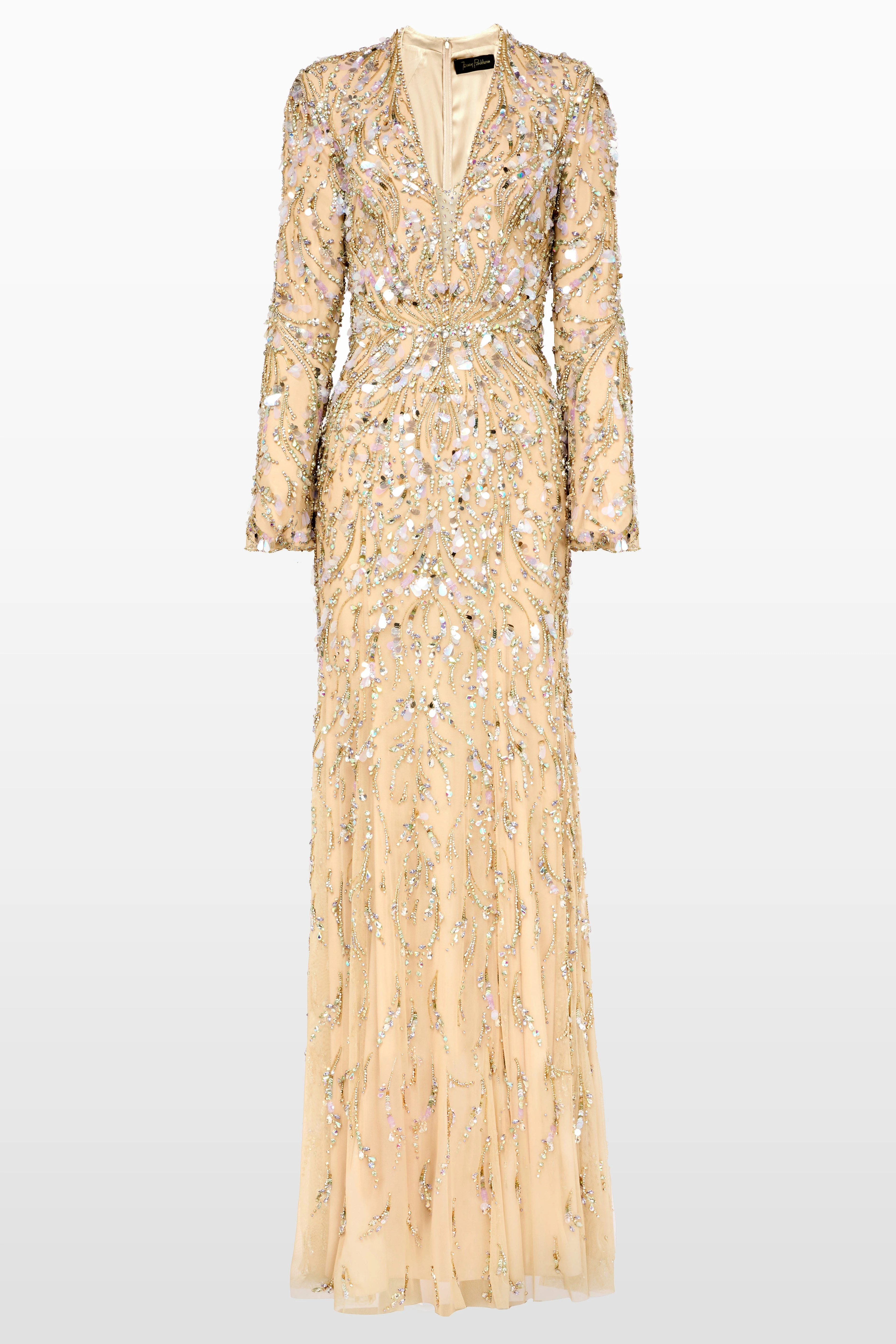 Radiate timeless glamour in this almond-hued gown, an exquisite creation adorned with shimmering beadwork and sequins that trace intricate patterns throughout. The plunging V-neckline and cinched waist create a beautifully flattering silhouette, accentuating the figure with grace and precision. Full-length sleeves add an elegant, sophisticated touch, enhancing the gown's refined appeal. The delicate embellishments reflect light gracefully, ensuring a breathtaking entrance at any event. Rear zip fastening Sequin embellishment V-neck Long sleeves