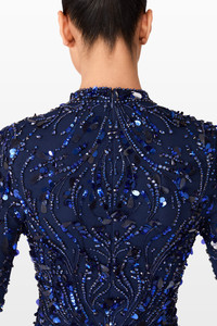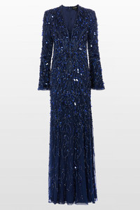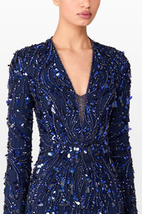 Radiate timeless glamour in this almond-hued gown, an exquisite creation adorned with shimmering beadwork and sequins that trace intricate patterns throughout. The plunging V-neckline and cinched waist create a beautifully flattering silhouette, accentuating the figure with grace and precision. Full-length sleeves add an elegant, sophisticated touch, enhancing the gown's refined appeal. The delicate embellishments reflect light gracefully, ensuring a breathtaking entrance at any event. Rear zip fastening Sequin embellishment V-neck Long sleeves