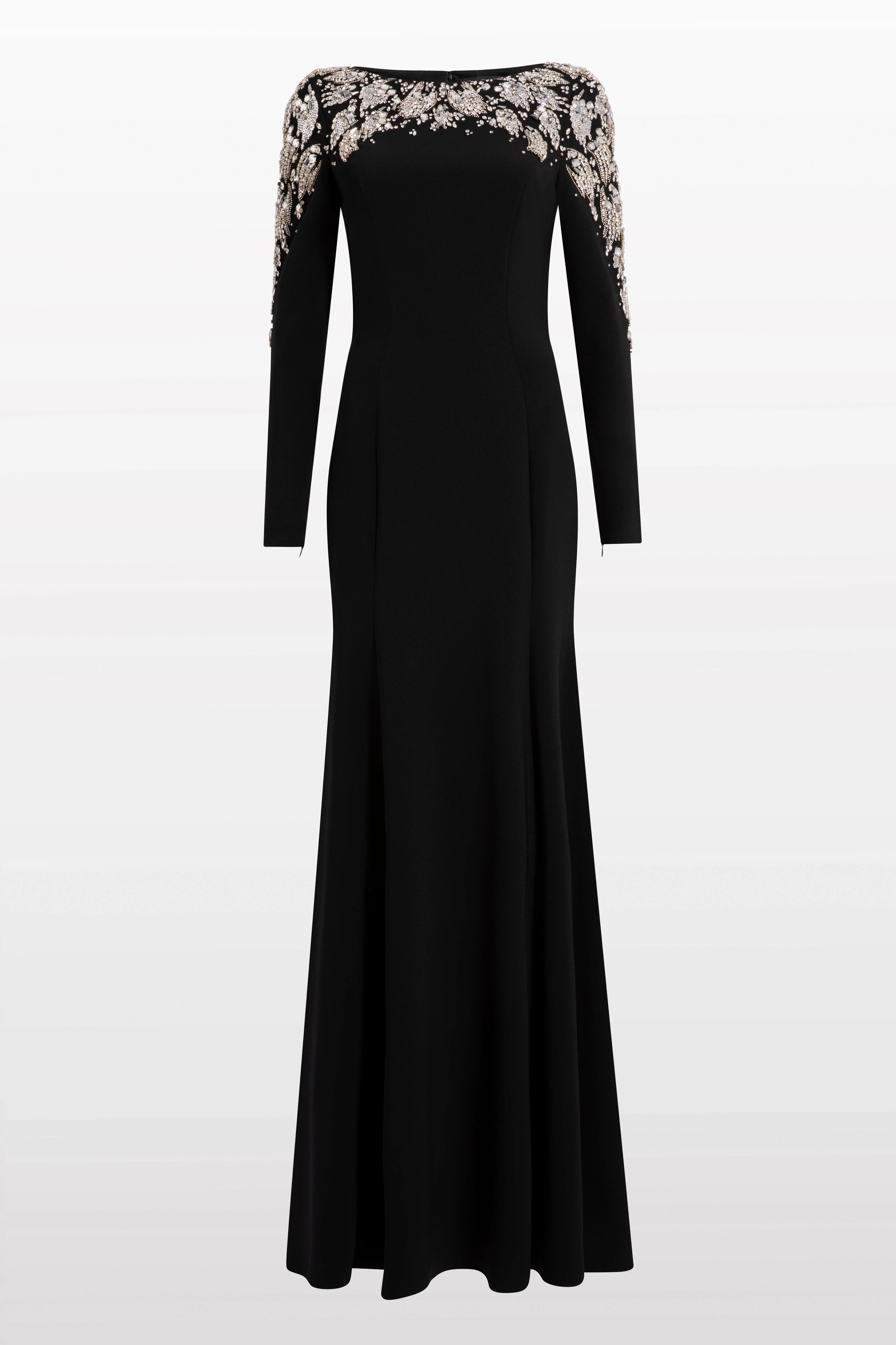 Timeless and refined, this gown features an elegant floor-length silhouette with delicately embellished shoulders. The fitted bodice and long sleeves create a sophisticated shape that flatters while maintaining a sense of poise and grace. Ideal for formal evening occasions or red-carpet events. Shoulders embellishments Long sleeves Boat neck Concealed zip fastening Floor-length