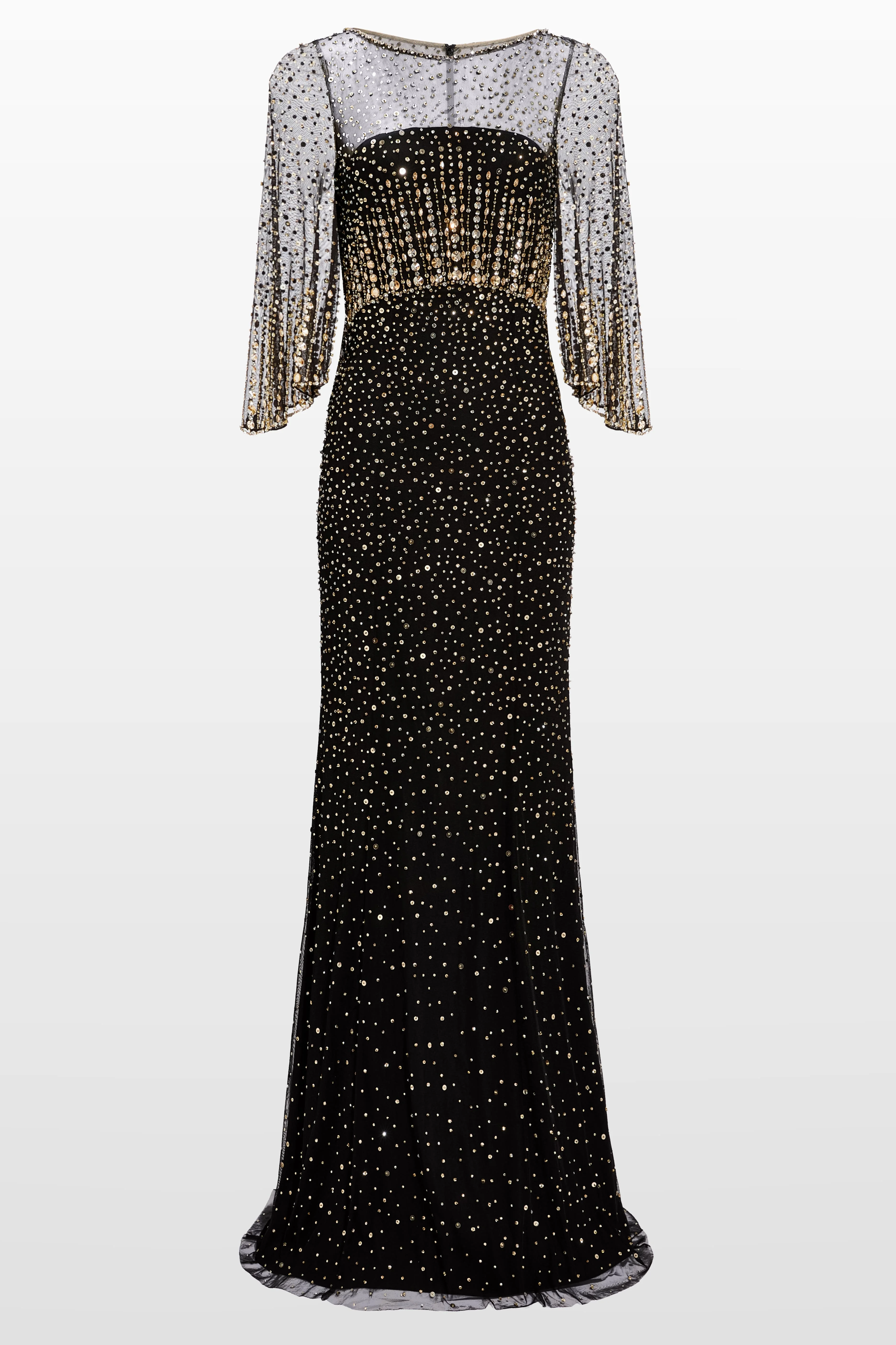 This gown combines sheer layering with structured elegance, delivering polish with a touch of edge. The silhouette is sleek and minimal, contrasted by an embellished overlay that extends into three-quarter sleeves. Hand-applied crystals cascade from the neckline and gather at the waist before scattering into the skirt, creating dimension, texture, and movement. A modern evening look with just the right amount of shine. Concealed rear zip fastening Crystal embellishment Semi-sheer overlay Half-length sleeves