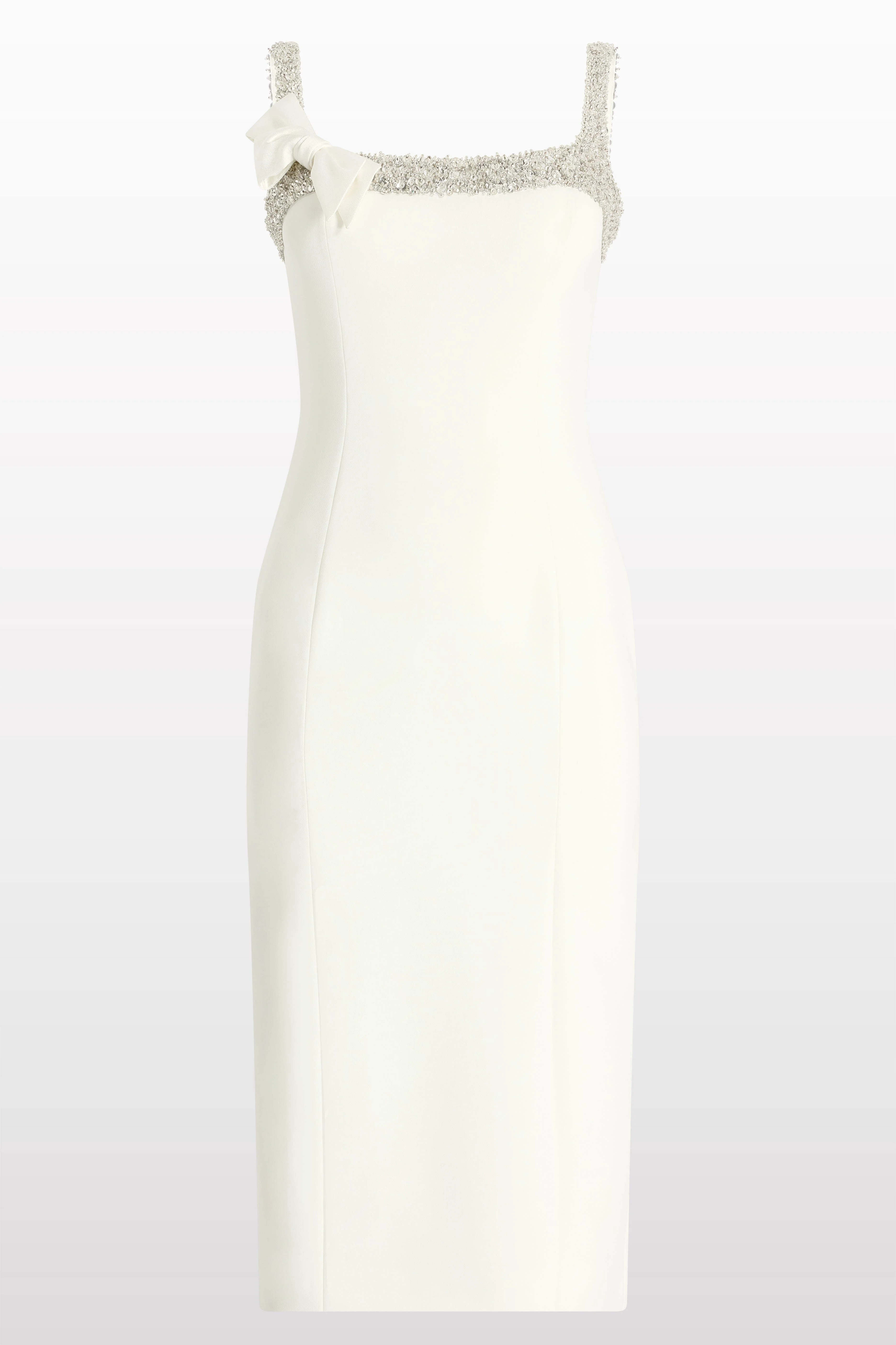 A timeless cocktail dress defined by its sculpted silhouette and subtle femininity. The square neckline and straps are framed with delicate embellishment, while a soft bow accent adds a touch of charm. Sleek and refined, its a beautiful choice for receptions, rehearsal dinners, or elegant city celebrations. Crystal embellishment Bow detail Square neck Rear zip fastening