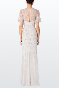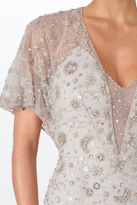 This stunning gown features exquisite beading with delicate moon and star motifs, evoking a celestial luxury. The floor-length silhouette, combined with a sheer, embellished overlay and elegant V-neckline, makes it perfect for high-end events. Ideal for exclusive galas, opulent weddings, red carpet affairs, or any occasion where sophisticated luxury is paramount. Highlights Aqua blue Rear zip fastening Crystal embellishment V-neck Short sleeves