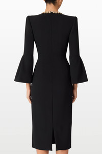 A sophisticated cocktail dress with a sleek, fitted silhouette, featuring intricate embellishments that sparkle across its neckline for a touch of refined elegance. The clean lines and flared sleeves create a polished look. Perfect for elegant daytime events and cocktail hours, it effortlessly combines timeless style with modern charm. Highlights Jewel embellishment at neckline Bell sleeves Concealed zip fastening