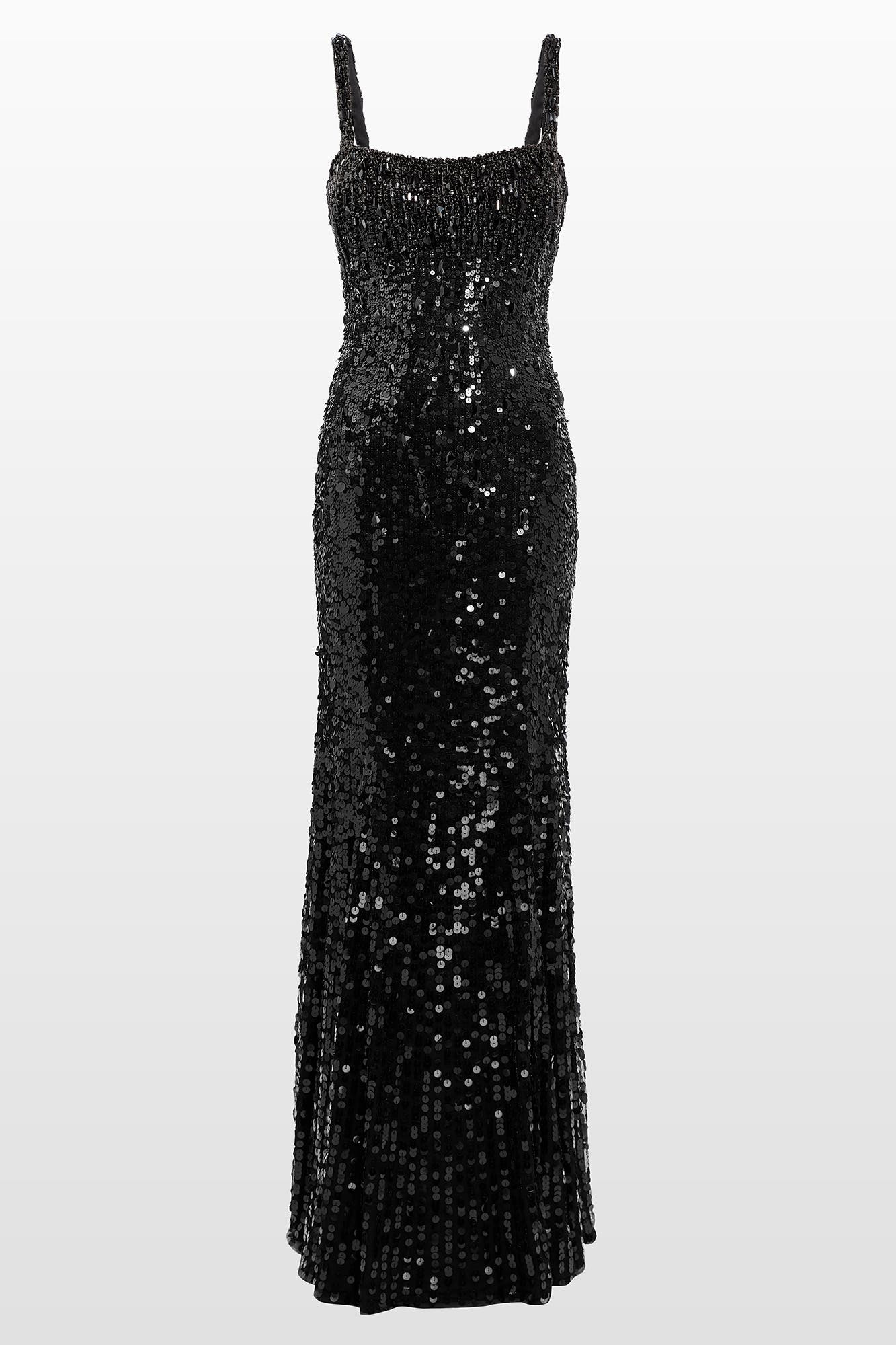 Framed by delicate straps and a Square Neckline, this gown is fully adorned with light-catching embellishment for a striking finish. The silhouette is fitted through the bodice and gently flares towards the hem, creating a balanced and elegant shape. The sparkle subtly shifts in tone from top to bottom, adding a dynamic touch. Ideal for formal occasions, evening receptions or red carpet moments. Highlights Concealed rear hook and zip fastening Crystal embellishment Sequin design Square neck