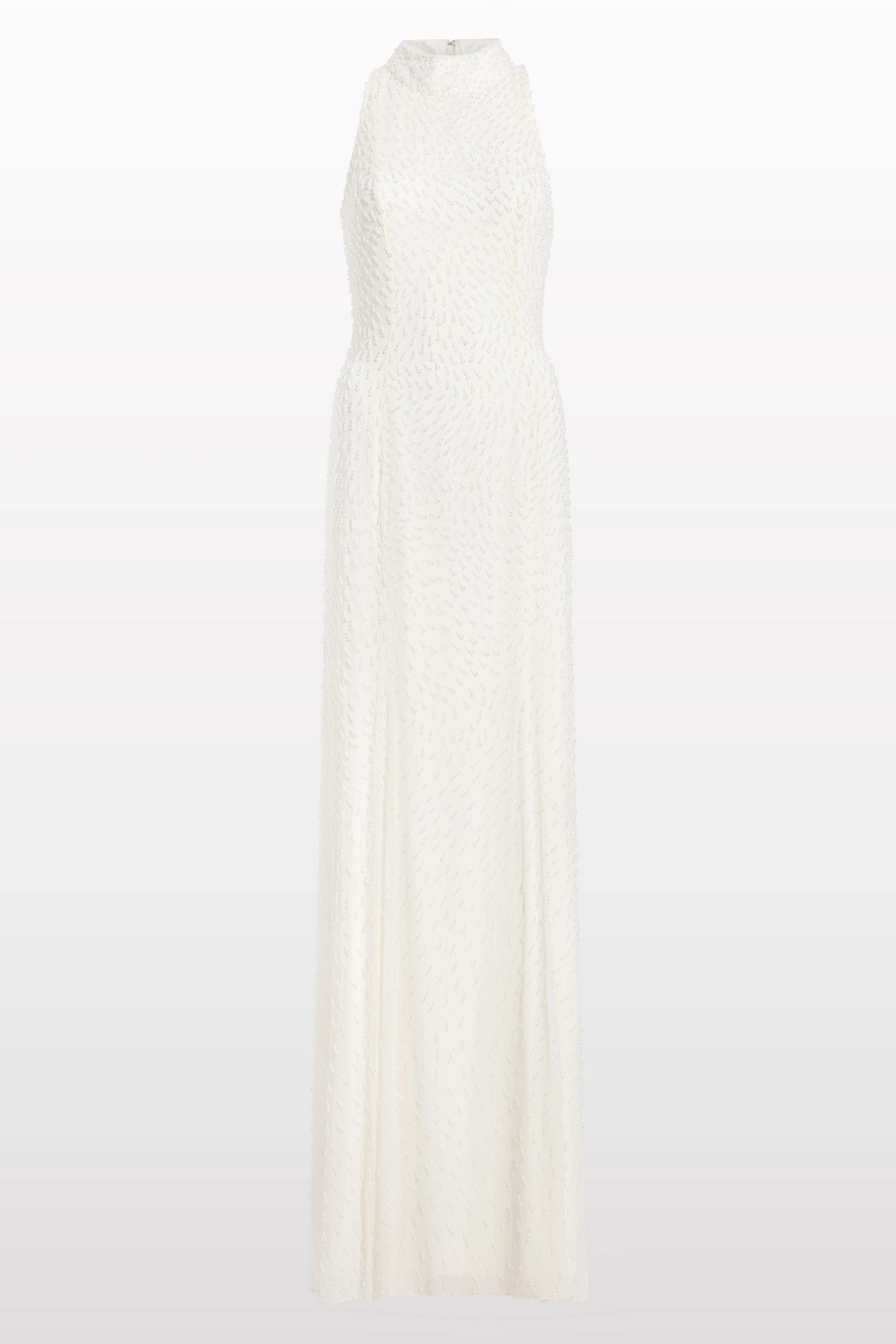 Sleek and sculptural, this designer wedding dress celebrates contemporary minimalism with subtle texture and form. The high neckline and open back create a refined contrast, enhancing the gown’s clean, elongated silhouette. Its fluid column shape moves with quiet confidence, highlighting every curve with effortless precision. Modern and understated, it epitomises sophisticated bridal design. MISSING BULLETS