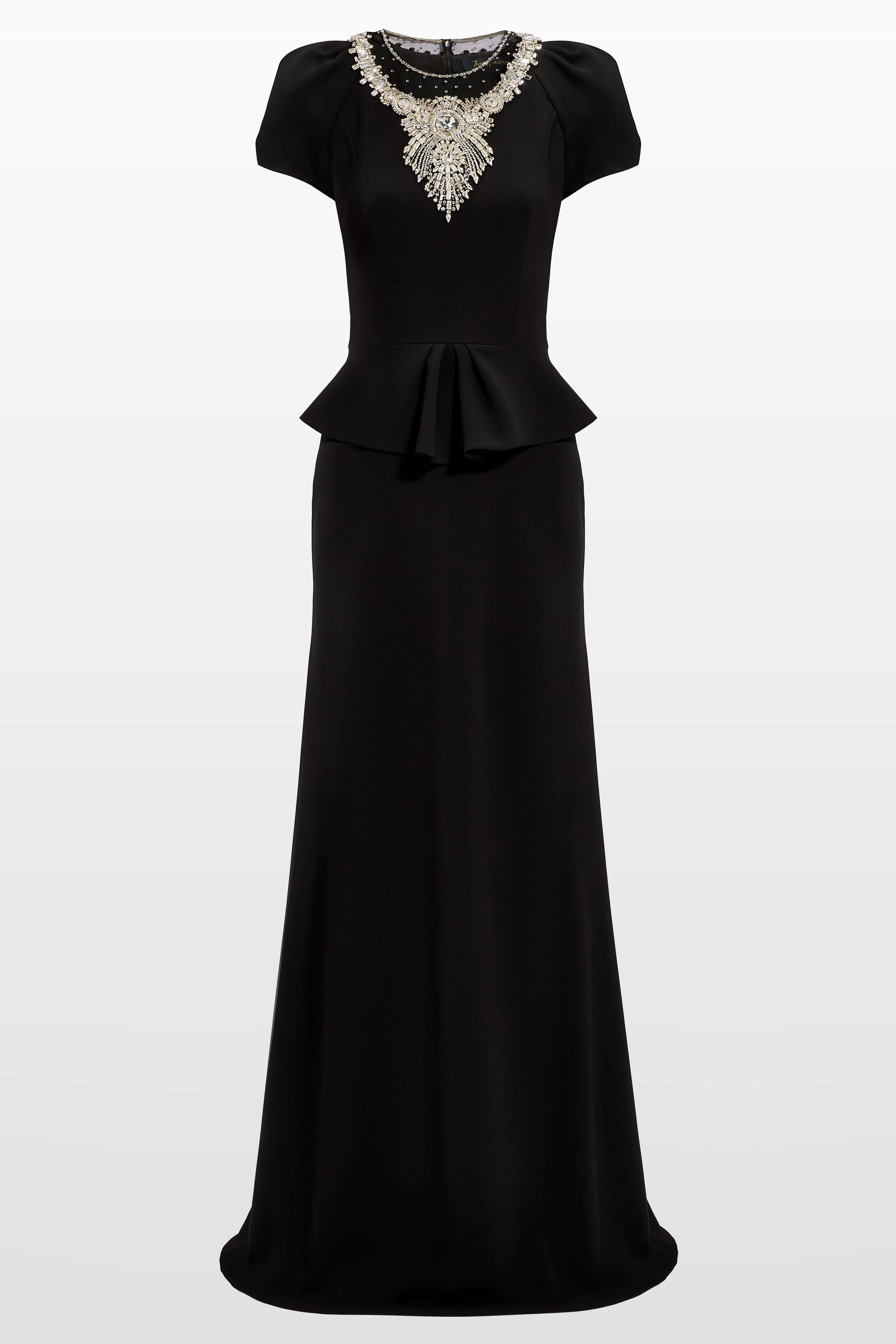Tailored with exactitude, this dress offers a modern take on classic structured elegance with modern simplicity. The fitted bodice is framed by short sleeves and a round neckline, adorned with intricate embellishment that adds a subtle touch of sparkle. A soft peplum detail at the waist enhances the silhouette, flowing into a clean, streamlined skirt. A refined choice for occasions that call for understated glamour and timeless sophistication. Crystal embellishment Short sleeves Peplum detail Concealed zip fastening