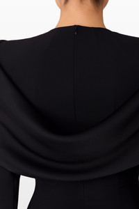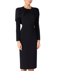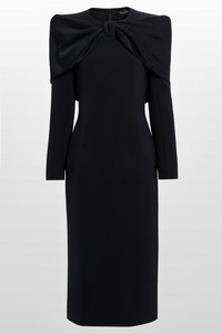 A sophisticated cocktail dress with a sleek, fitted silhouette, featuring an oversized bow at the neckline for a touch of refined elegance. The clean lines and tailored design create a polished look. Perfect for elegant daytime events and cocktail hours, it effortlessly combines timeless style with modern charm. Highlights Concealed rear zip fastening Crew neck Long sleeves Rear slit