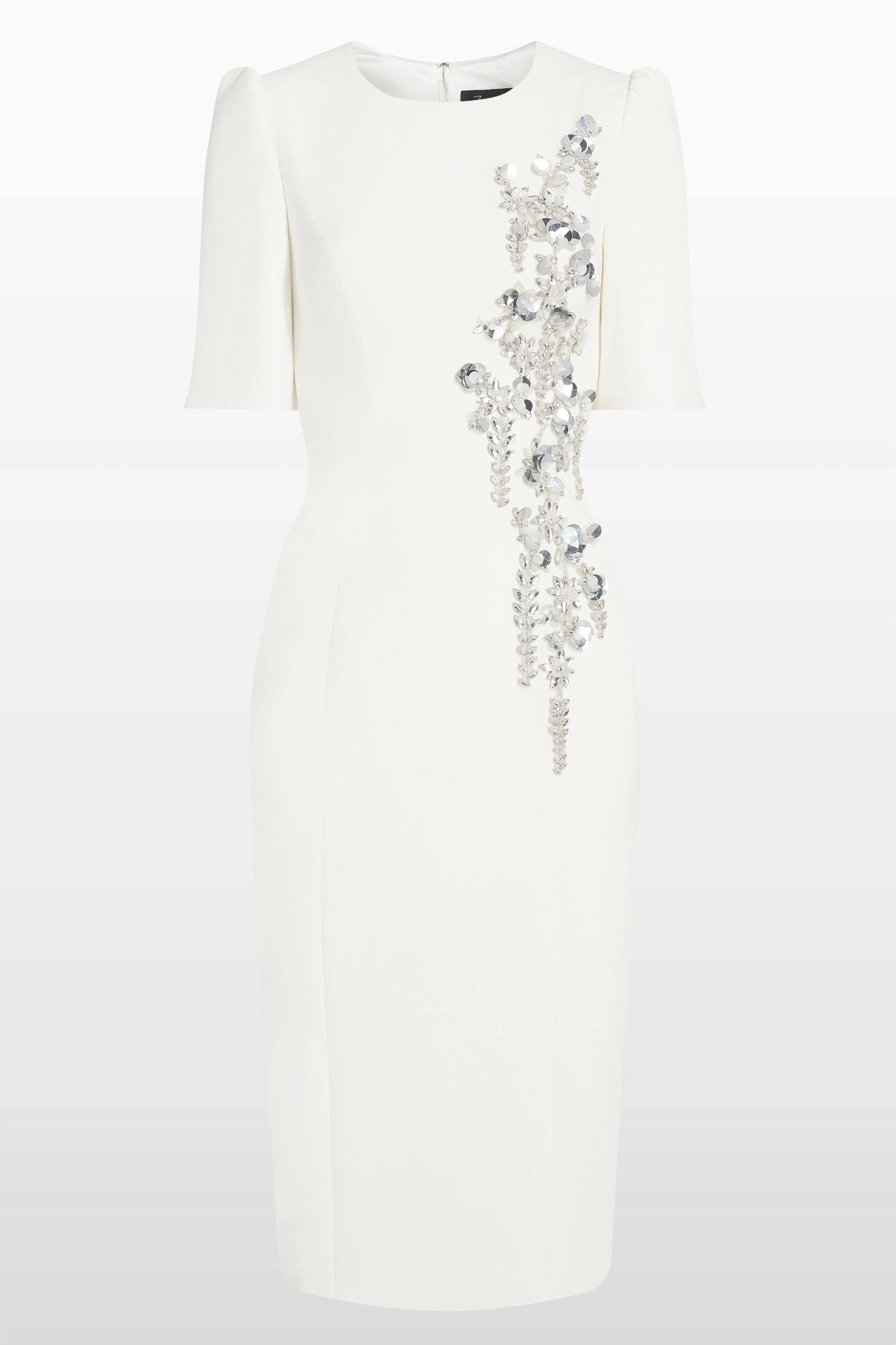 This refined cocktail dress combines clean structure with intricate detailing. Cut in a tailored midi silhouette, it features softly flared short sleeves and an elegant round neckline. A cascade of delicate embellishment trails along the bodice, adding subtle depth and luminosity. An ideal choice for daytime ceremonies, receptions, or polished evening gatherings. Short sleeves Round neck Rear zip fastening