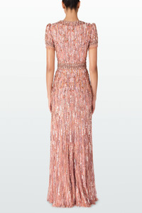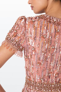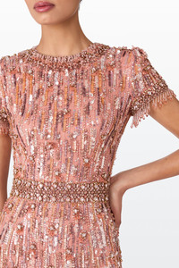 This stunning gown is intricately decorated with beads and sequins, creating a richly textured and luxurious appearance. It features a fitted bodice with a high neckline and short sleeves, emphasizing elegance and sophistication. The waist is accentuated with a beaded band, and the skirt flows gracefully to the floor, enhancing its regal and glamorous style. Perfect for high-profile events, such as gala dinners or red carpet occasions, this dress exudes luxury and statement-making style. Highlights Rear zip fastening Sequin embellishment Round neck Short sleeves