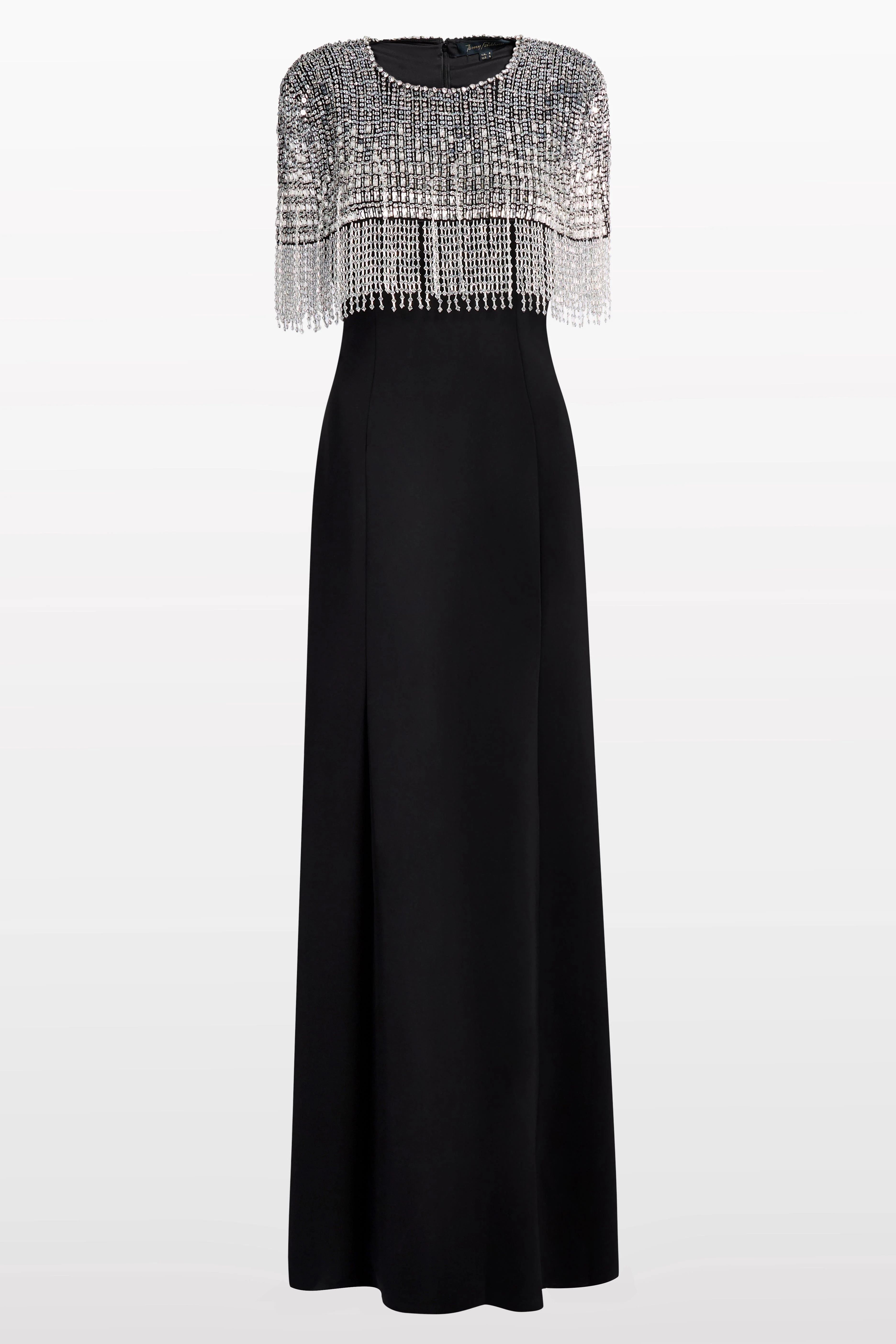This gown exudes understated elegance, defined by its clean, floor-sweeping silhouette contrasted with a statement crystal fringe cape overlay. The sleek strapless base creates a refined canvas, while the draped embellishment introduces movement, sparkle, and couture-level detail. The structured yet fluid design ensures a commanding presence, balancing simplicity with high-impact glamour. Perfect for gala dinners, formal receptions, and red carpet occasions, this gown guarantees a striking and memorable entrance. Beaded embellishment Fringed detailing Floor-length