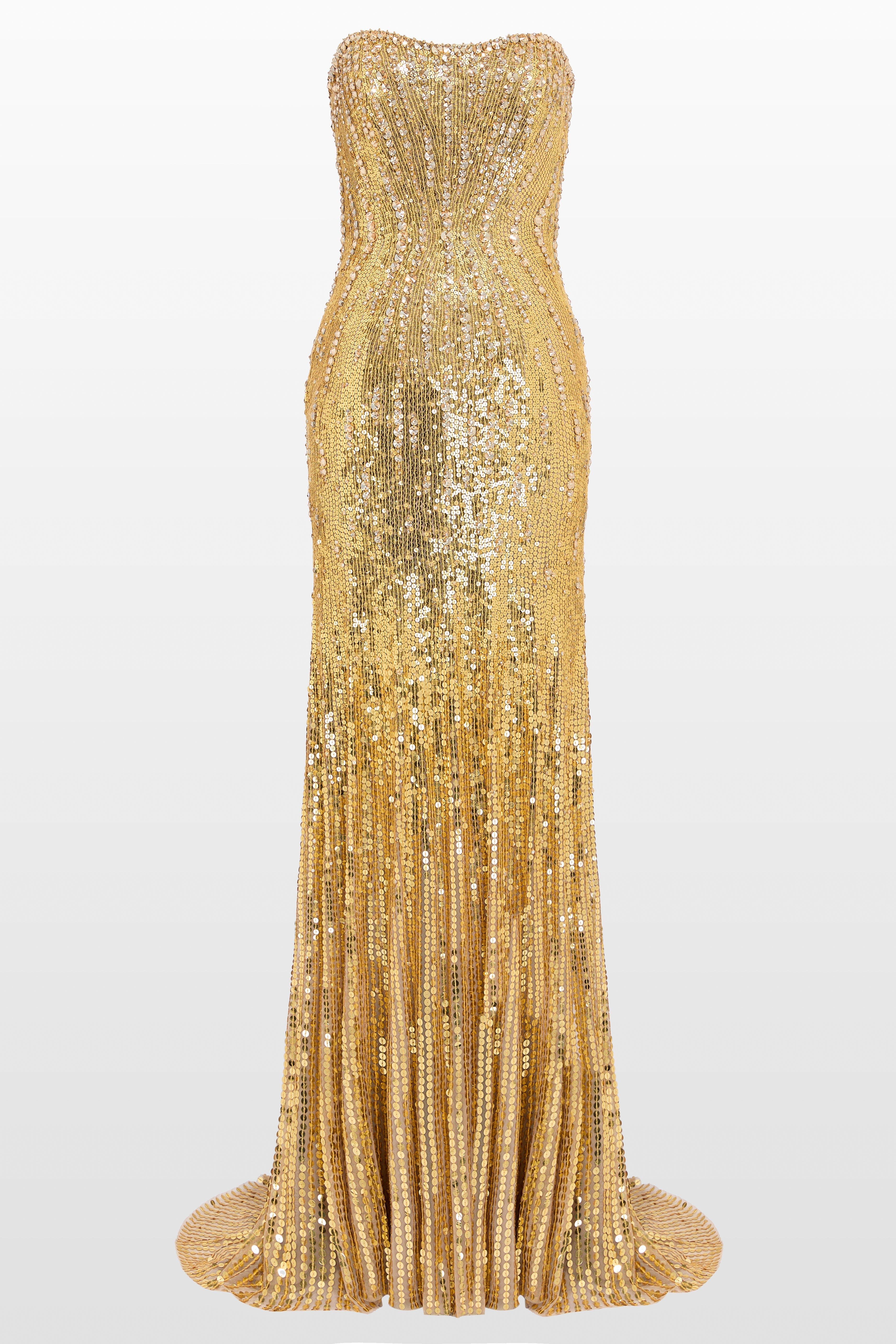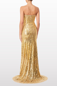 Steal the spotlight in this stunning strapless gown, a shimmering masterpiece of glamour and sophistication. Adorned with intricate sequins that cascade from the fitted bodice to the floor-length hem, this gown creates a radiant, light-catching effect. The streamlined silhouette skims the figure beautifully, while the strapless neckline adds a touch of timeless allure and modern elegance. Bead embellishment Concealed rear zip fastening Strapless Sleeveless Fitted waistline Maxi Satin lining