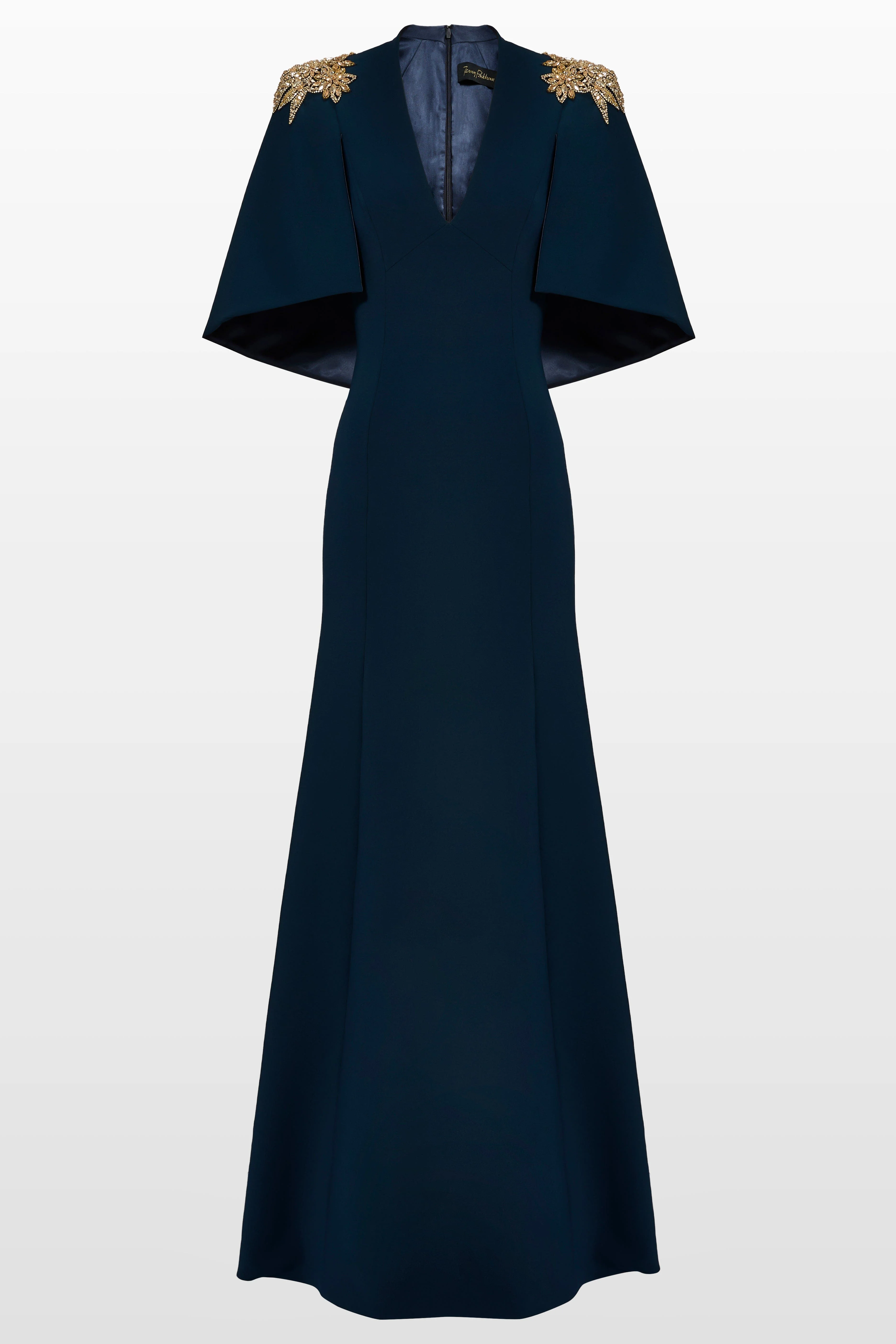 This gown strikes a confident balance between architectural drama and refined elegance. Cut to contour the silhouette, it features a deep V neckline and striking cape-style sleeves that create bold, fluid movement with every step. Embellishment at the shoulders adds a subtle touch of sparkle, drawing the eye to the gowns sculptural lines. The clean, elongated skirt completes the look with understated sophistication perfect for evenings that call for modern glamour with a statement finish. Rhinestone embellishment V-neck Short sleeves Floor-length Concealed rear zip fastening