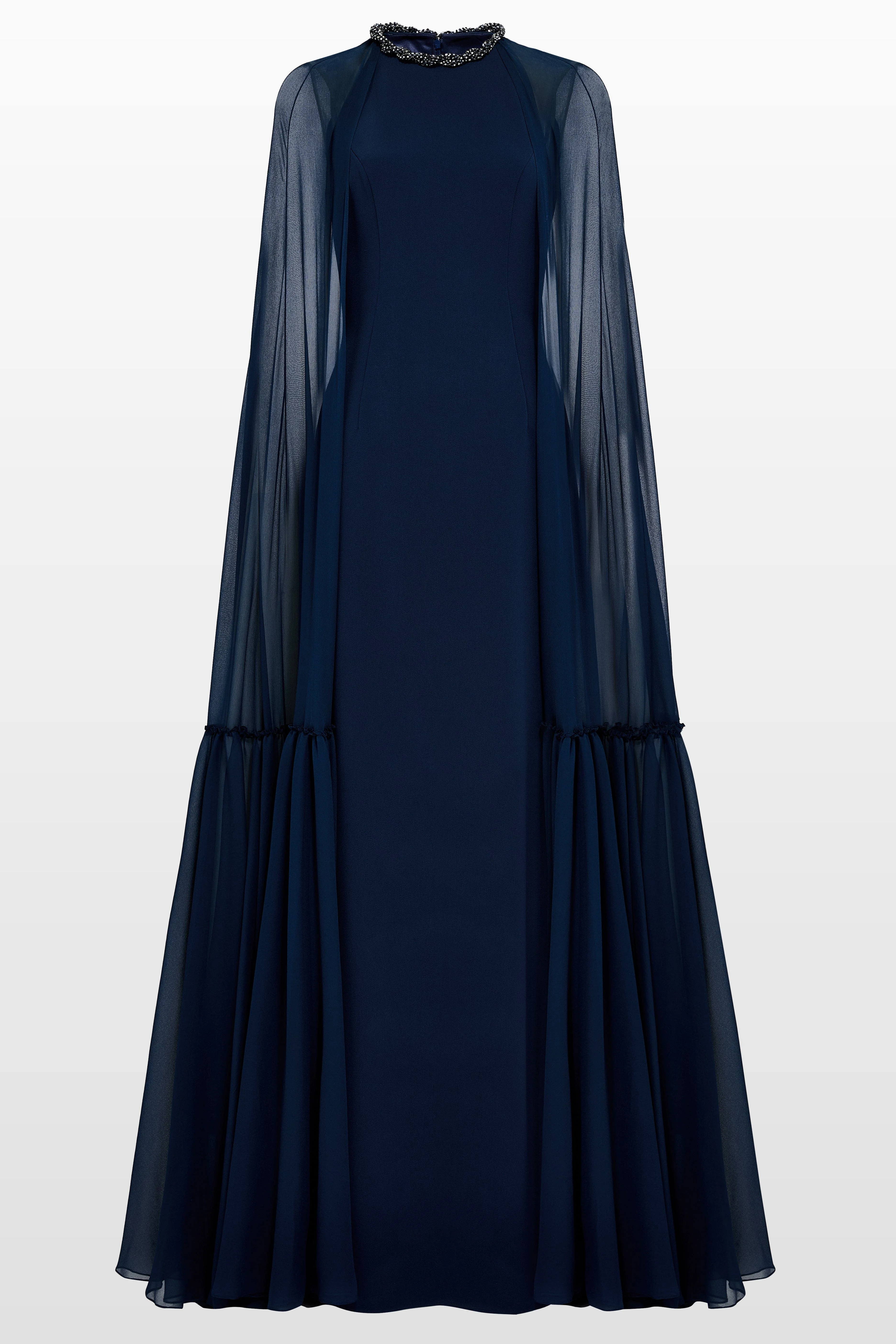 A study in dramatic elegance, the Storm gown is defined by its fluid silhouette and sweeping cape sleeves in sheer chiffon. The clean, structured bodice is framed by a soft embellished neckline, offering subtle shimmer against the depth of the blackthorn blue. A timeless choice for evening receptions or formal occasions, this piece brings understated grandeur to elevated dressing. Deaded neckline Cape design