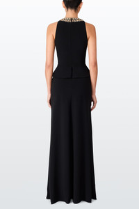 Designed with a High Neckline and sleeveless cut, this gown features intricate embellishment through the collar and bodice. A soft peplum detail adds structure and definition at the waist, leading into a fluid, floor-length skirt. The clean lines and subtle shaping give it a polished, modern feel. Ideal for formal receptions, weddings or black-tie events. Highlights Concealed rear zip fastening Peplum waist Rhinestone embellishment Bead detailing