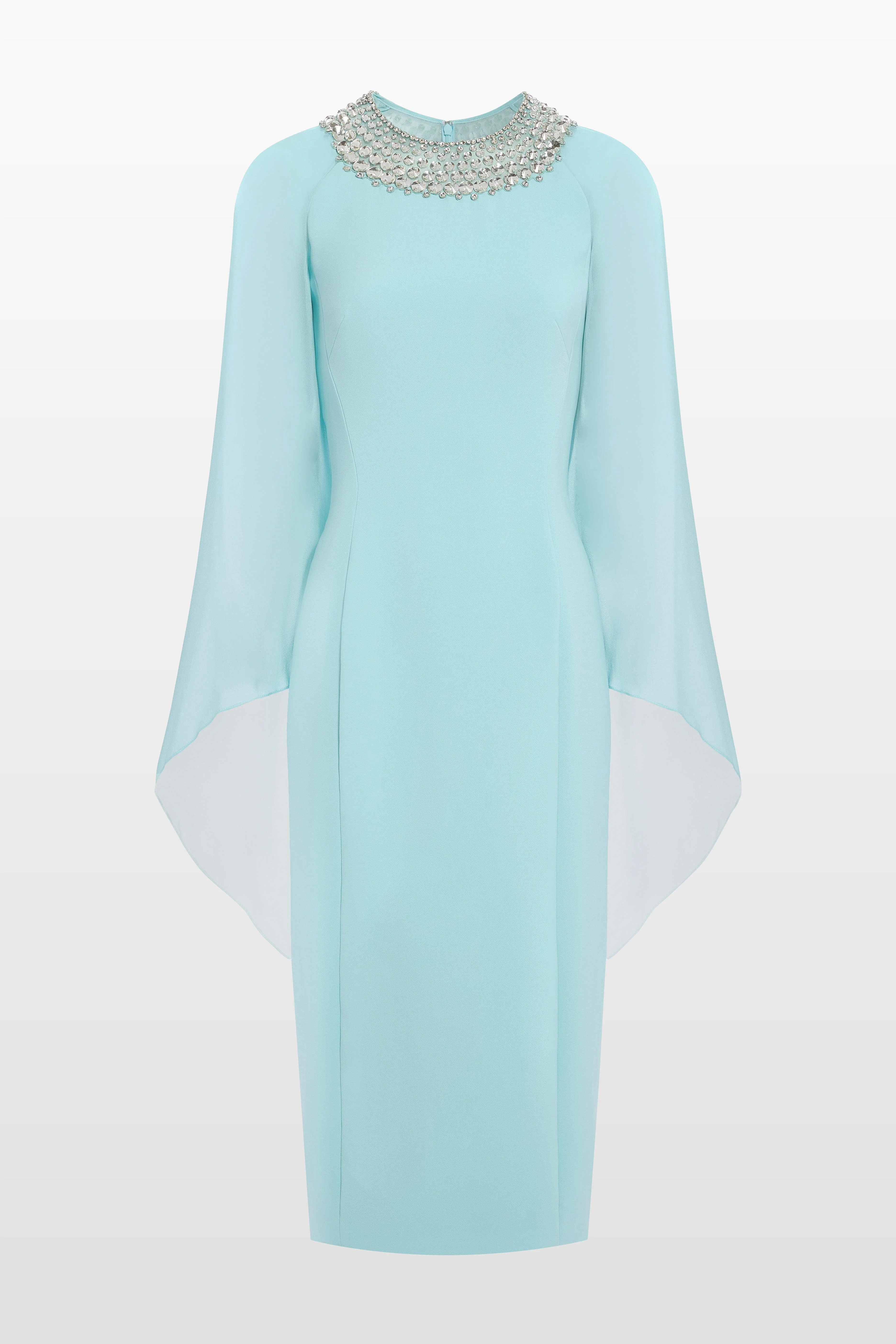 Effortlessly captivating, this mid-length dress is a study in fluid elegance. Its sculpted silhouette gently contours the body, creating a refined yet feminine shape that exudes timeless sophistication. The sheer, flowing sleeves add a poetic sense of movement, cascading with every step. At the neckline, a halo of intricate embellishmentsreminiscent of scattered diamondslends a luminous touch, framing the face with subtle radiance. Whether worn at an elegant evening affair or a momentous occasion, it speaks in whispers confidence, and powerful allure. Crystal embellishment Crew neck Back vent Long draped sleeves Semi-sheer panels Concealed rear zip fastening