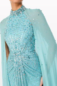 Striking yet refined, Thea is a piece designed for grand entrances, unforgettable farewells, and every moment in between that deserves the spotlight. This gown redefines evening drama with its structured silhouette and fluid overlay. The high neckline and gathered bodice create a cinched, hourglass effect, while the gown's surface glimmers with precise embellishment that catches light in rhythmic motion. A sheer, floor length cape flows from the shoulders, adding ethereal dimension and theatrical elegance. Mock neck Cape sleeves Sequin embellishment Crystal embellishment Beaded embellishment Pleated bodice