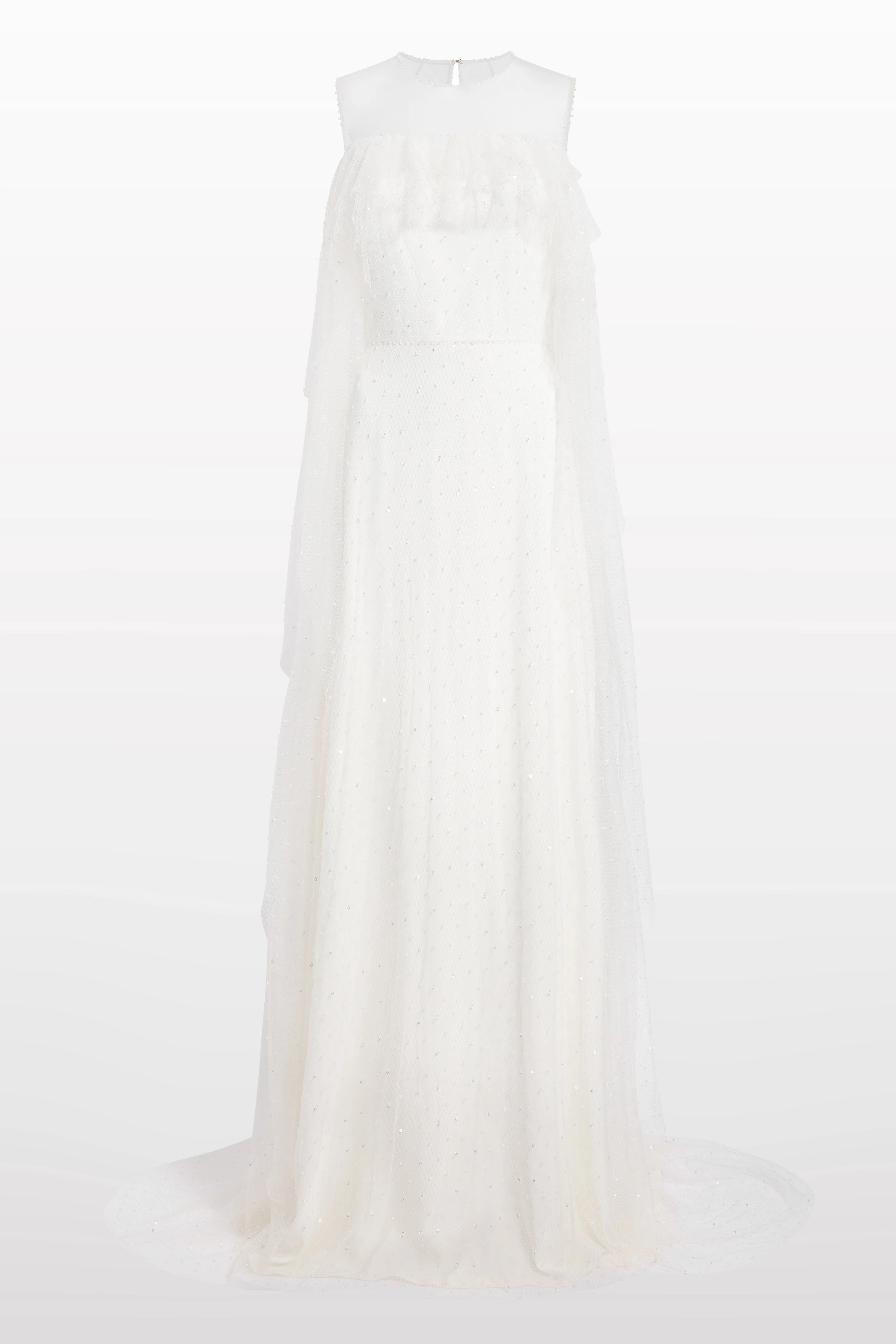 This designer bridal gown exudes ethereal sophistication with its off-shoulder neckline and cascading layered cape sleeves. The fluid silhouette is adorned with delicate embellishment that subtly illuminates the fabric, creating an understated shimmer in motion. Combining modern artistry with timeless grace, this luxury wedding dress embodies refined elegance and effortless romance. Sheer panel Ruffled detailing Cold-shoulder design Rear zip fastening