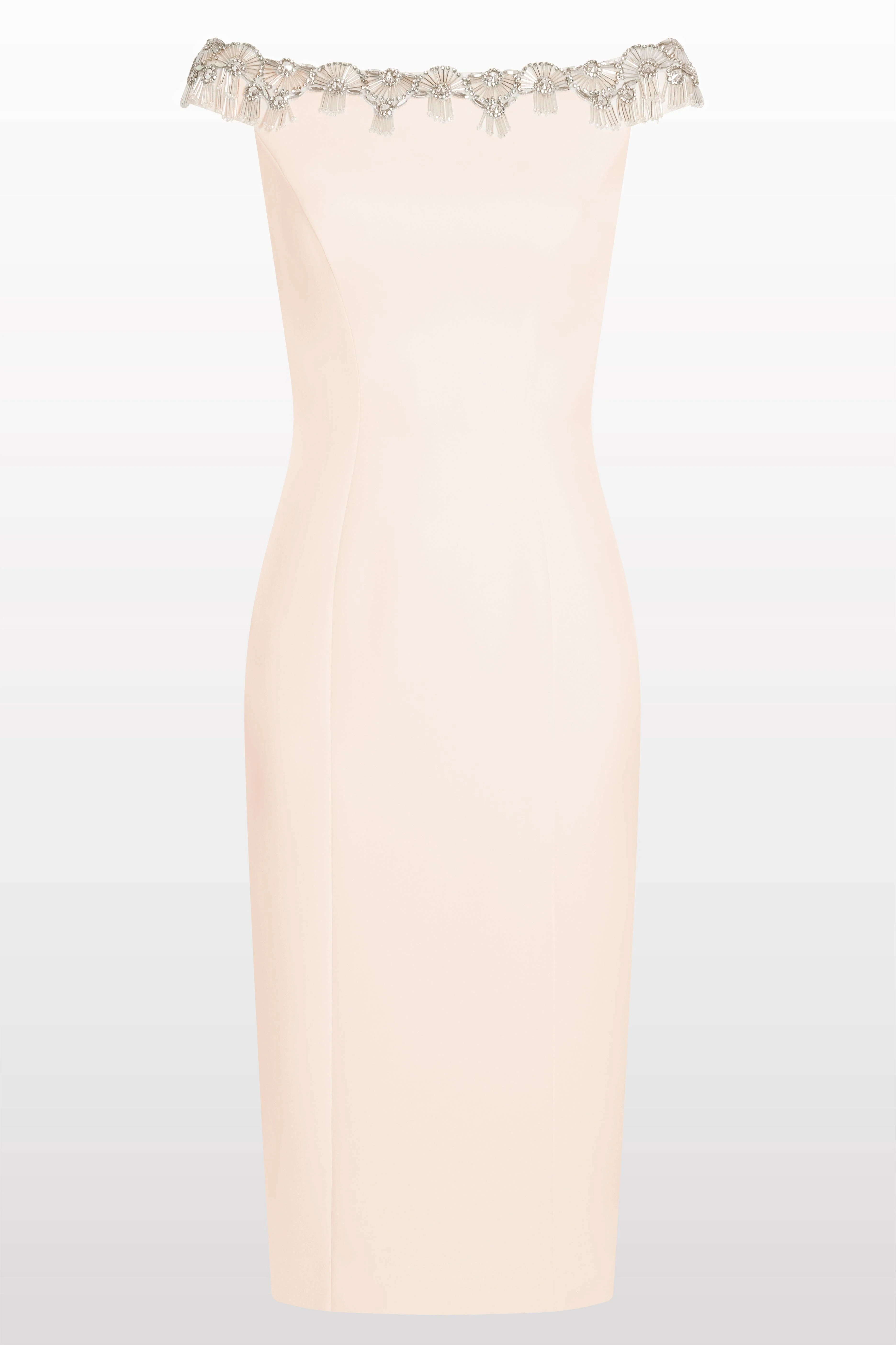 Elegant and understated, this cocktail dress features a refined column silhouette that skims the body with effortless precision. The off-the-shoulder neckline is delicately embellished, adding a touch of luminosity to its clean, structured form. Minimal yet intricate, it embodies timeless sophistication ideal for receptions, elegant soires, or refined celebrations. Bead embellishment Off-shoulder Rear slit Rear zip fastening Fitted silhouette