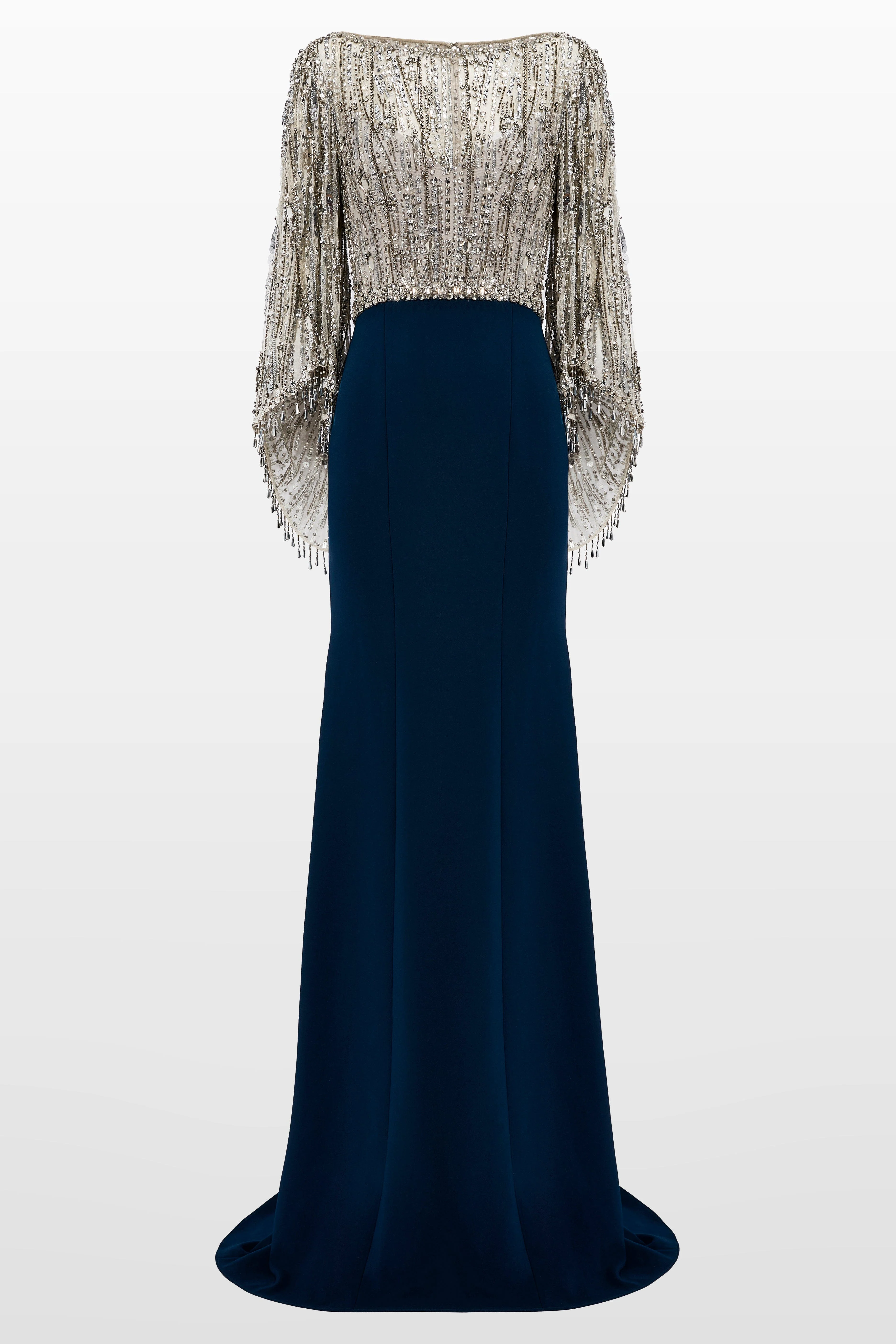 Wanderlust is the perfect blend of contemporary elegance with striking embellishment. The fitted silhouette is enhanced by a structured skirt and a bodice adorned with shimmering sequins and beadwork that cascade into delicate, sheer cape-like sleeves. A defined waistline adds flattering shape, while the fluid skirt offers graceful movement. A sophisticated choice for occasions that call for refined glamour with a dramatic touch. Sequin embellishment Bead embellishment Round neck Long sleeves Floor-length