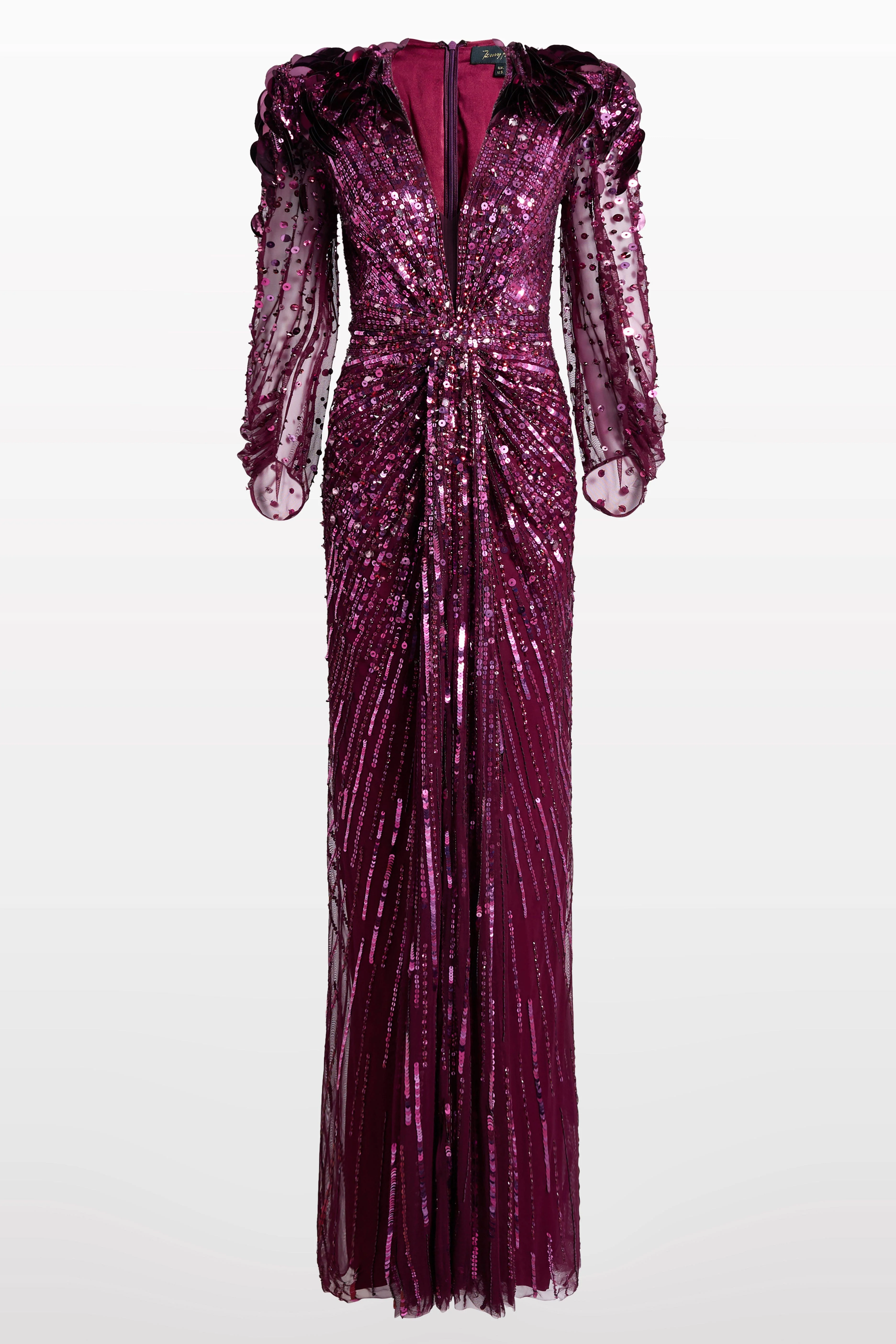 This evening gown embodies dramatic sophistication, with its plunging neckline, ruched waist detailing, and floor-sweeping silhouette. Sheer embellished sleeves and softly structured shoulders add depth and couture-like presence, while the intricate sequins throughout create a dazzling light-catching effect. The fluid drape enhances movement, balancing elegance with bold statement design. Perfect for gala dinners, red carpet moments, or exclusive evening events, this gown guarantees a striking and unforgettable entrance. Sequin embellishment V-neck Long sleeves Gathered detail Floor length