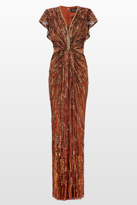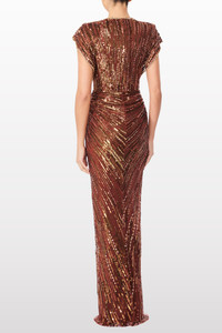 This exquisite gown is a celebration of refined craftsmanship. Featuring a beautifully draped silhouette that enhances the figure, an intricate gathering at the waist creates a flattering, statuesque shape. Adorned with shimmering sequins throughout, it catches the light effortlessly, offering a captivating sparkle from every angle. A deep V-neckline, framed by delicate embellishments, adds a touch of sophistication while drawing attention to the impeccable detailing. Perfect for any occasion where elegance is paramount. Sequin embellishment Concealed rear zip fastening Crystal embellishment V-neck Short sleeves Draped bodice Pencil silhouette Floor-length